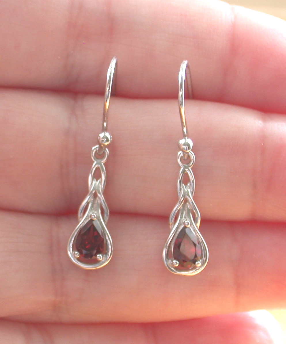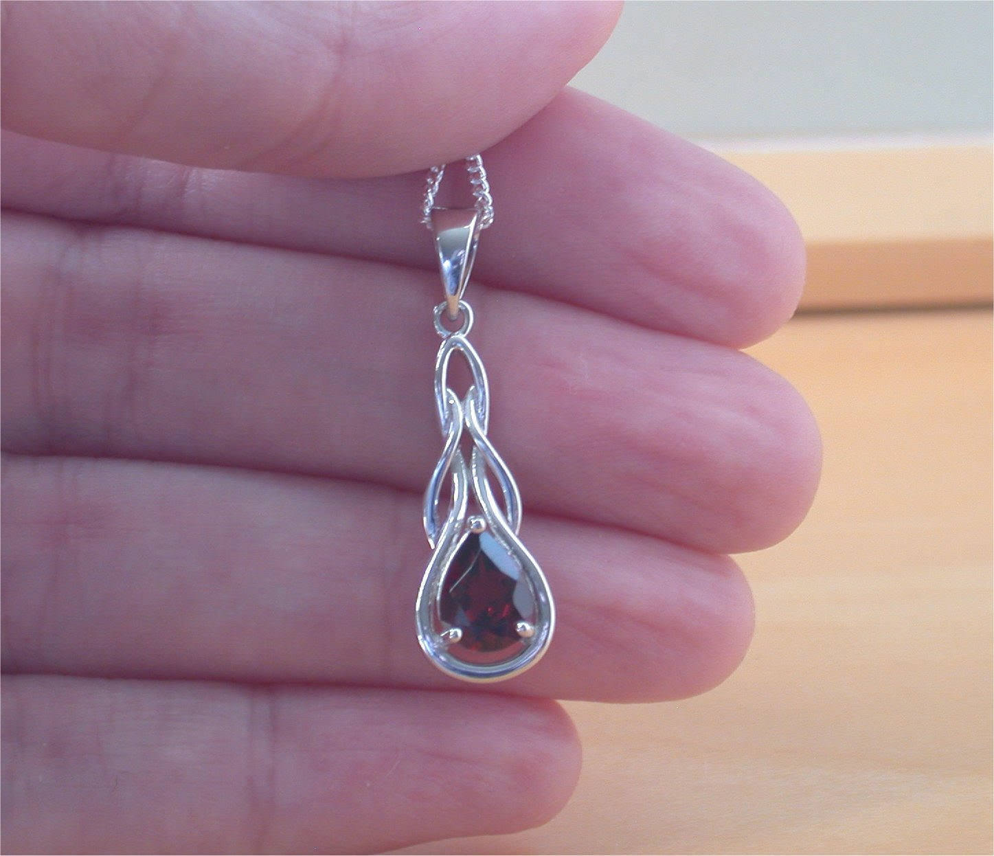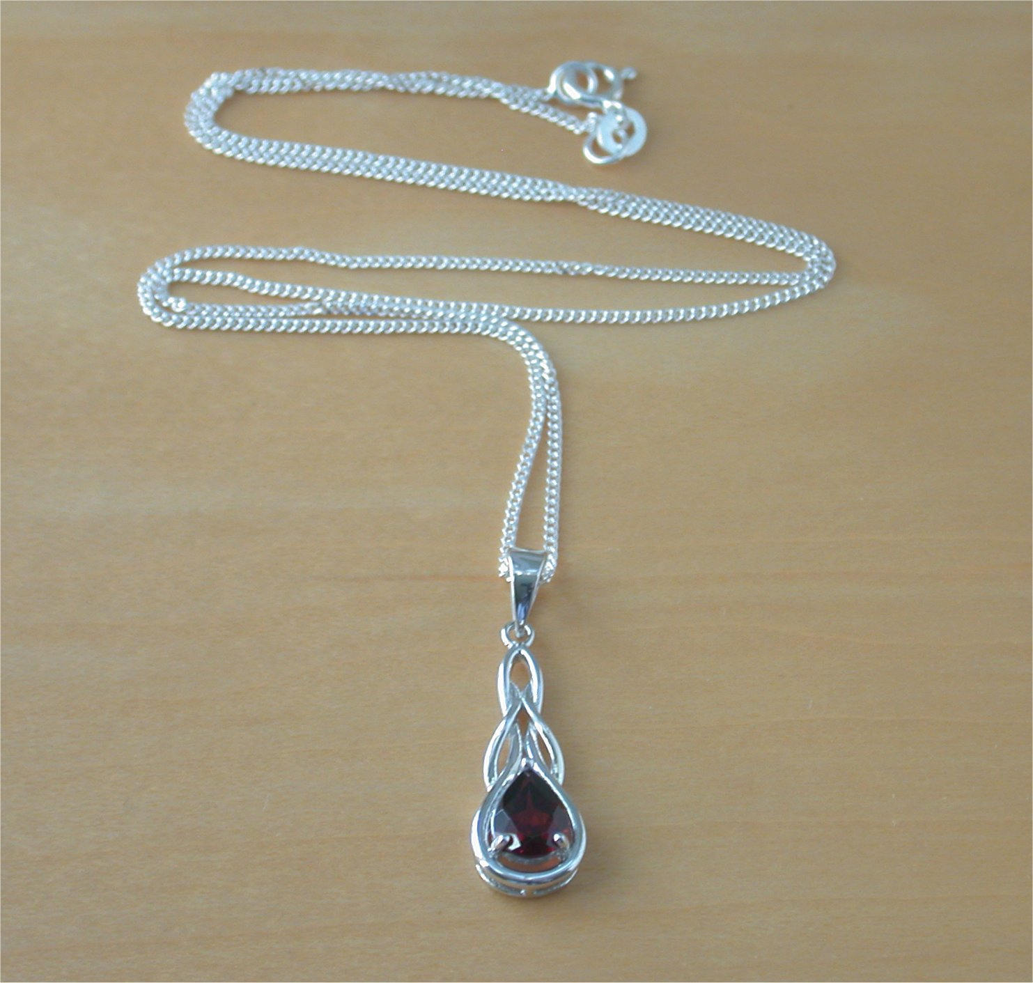 Sterling silver, oval design pendant set with genuine garnet gemstones. This pendant measures 25mm length x 10mm width. The garnet gemstone measures 9mm x 7mm. This pendant will come complete with 18 inch sterling silver curb chain(16 inch, 20 inch and 22inch chains are now available, please leave a note through checkout). The sterling silver garnet celtic earrings measure 17mm length x 7mm width. Stamped 925. Garnet is the birthstone for January.