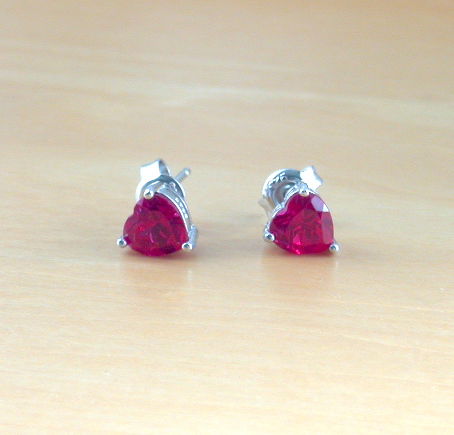 Sterling silver earrings set with ruby (lab created) heart gemstones. Each earring measures 5mm length x 6mm width. Both earrings are stamped 925. Ruby is the birthstone for July.