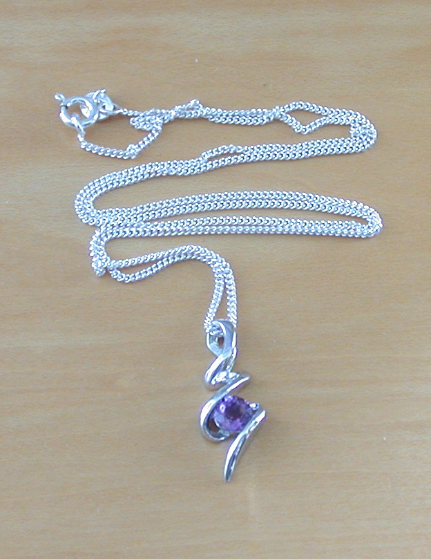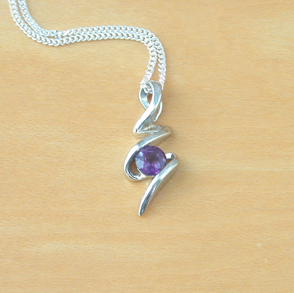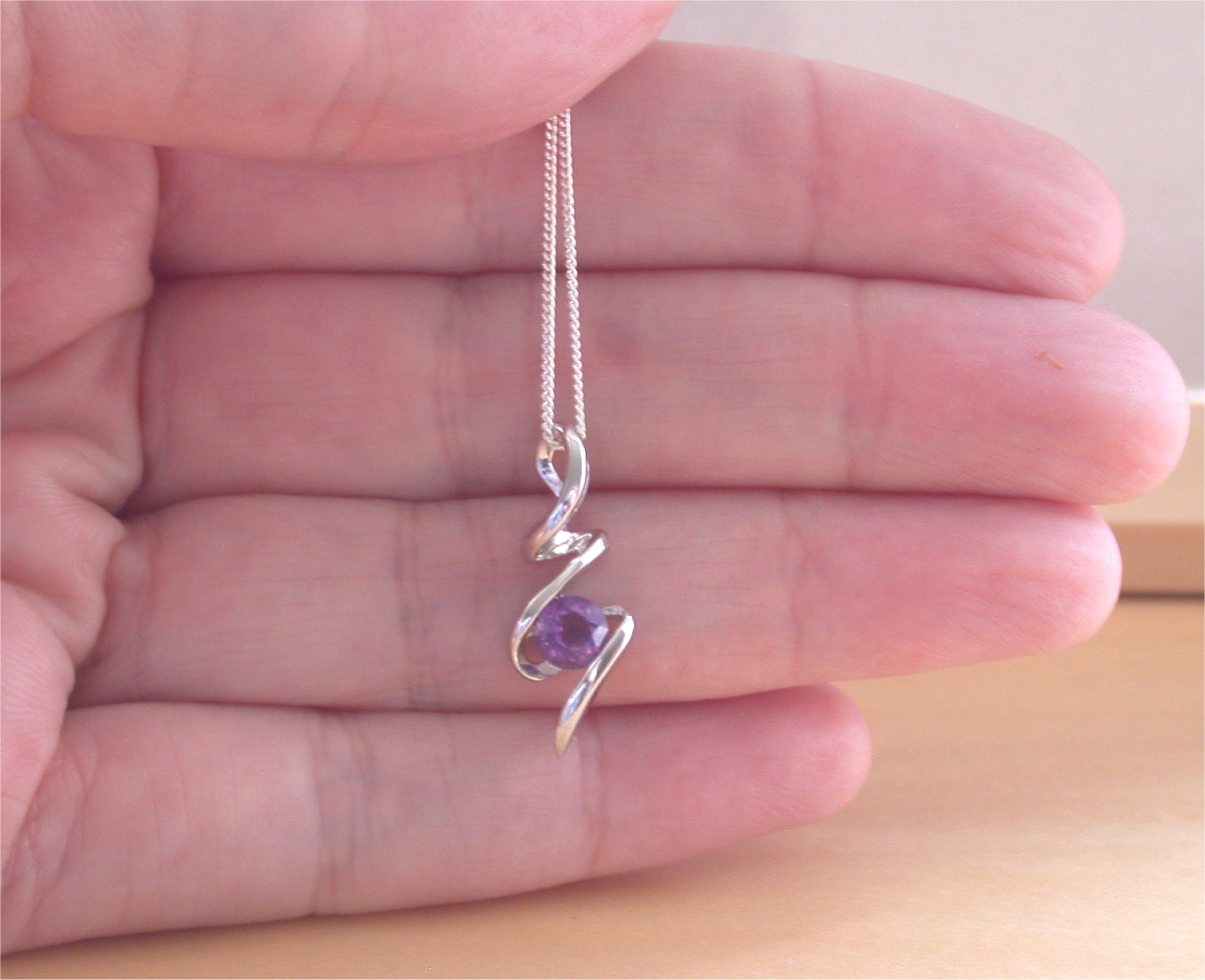 Sterling silver squiggle design pendant with amethyst gemstone. This pendant measures 23mm length x 8mm width. The center stone measures 5mm. This pendant will come complete with an 18" sterling silver curb chain (16, 20 & 22 inch chains now available, please leave message through checkout) Stamped 925. Amethyst is the birthstone for February.