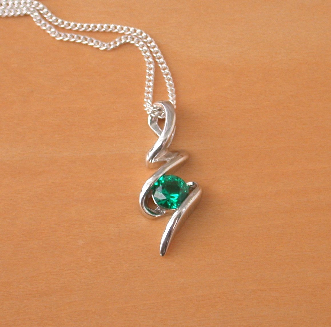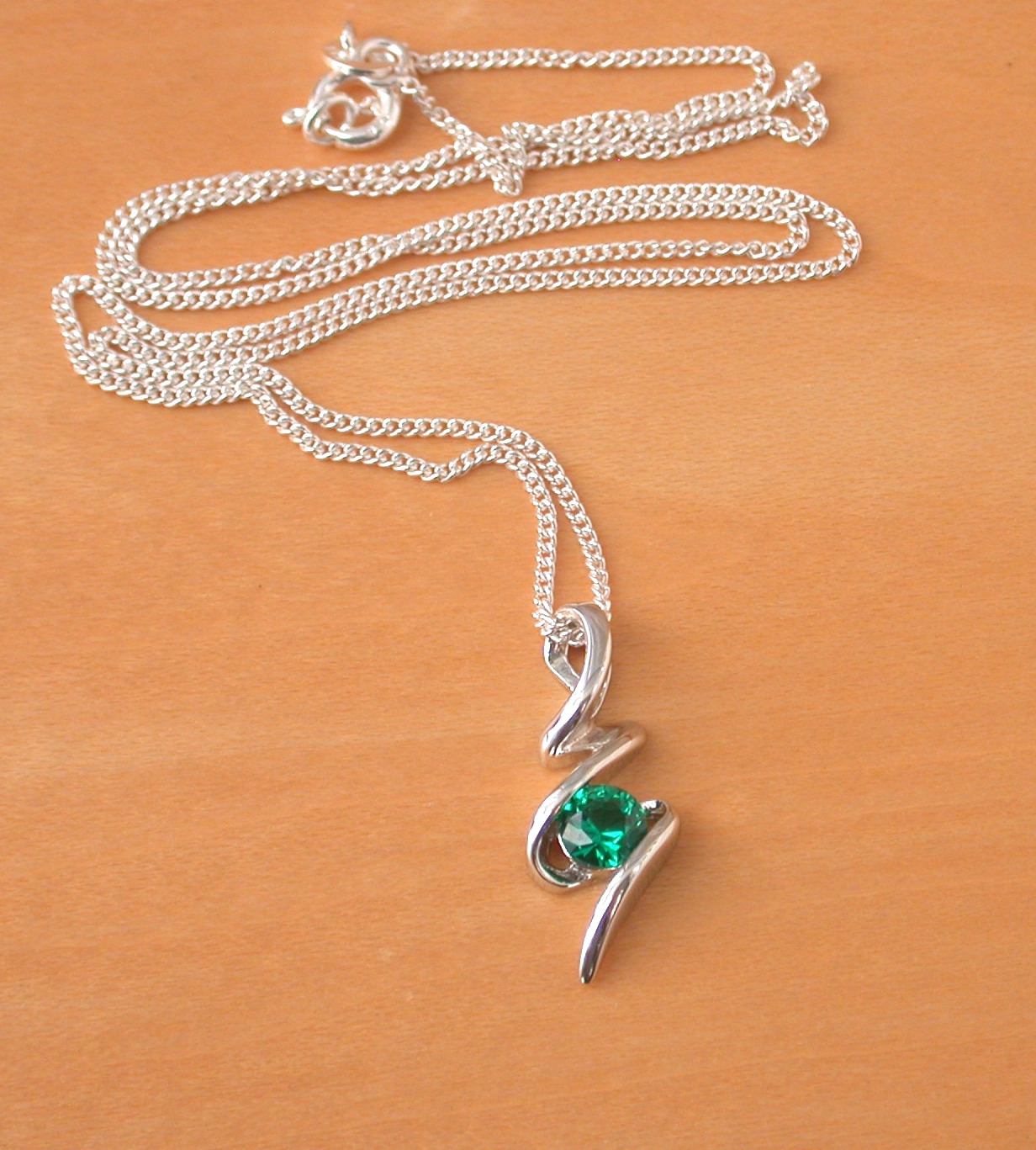 Sterling silver, Emerald (lab created) gemstone squiggle pendant. This pendant measures 23mm length x 9mm width (including the bale) and comes complete with an 18" sterling silver curb chain. The centre emerald stone measures 5mm. Stamped 925. Emerald is the birthstone for May.