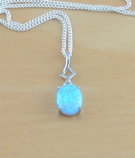 Sterling silver, oval design, blue opal pendant. This pendant will come complete with 18 inch sterling silver chain. (16, 20 & 22 inch chains now available, please leave message through checkout) The pendant measures 20mm length x 7mm width. The opal gemstone measures 9mm length x 7mm width. The blue opal gemstone is produced by synthesizing the silica beads that form natural opal. The pendant and chain are both stamped 925 on the back. Opal is the birthstone for October.
