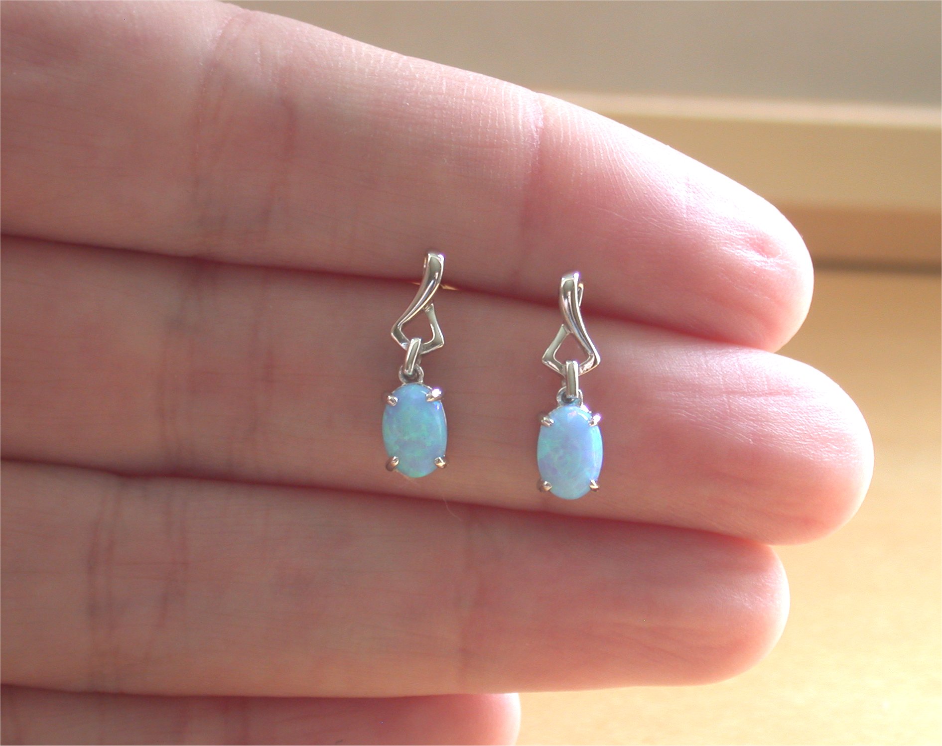 Sterling Silver drop earrings set with blue opal gemstones. This pair of stud earrings measure 16mm length x 5mm width. The opal gemstone measures 7mm x 5mm. Both earrings are stamped 925. The blue opal gemstone is produced by synthesizing the silica beads that form natural opal. Opal is the birthstone for October.