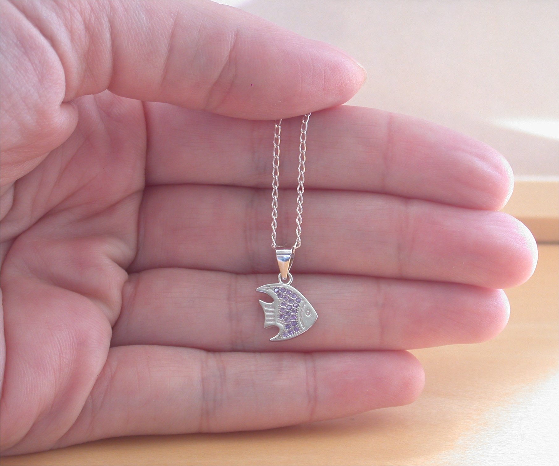 Sterling silver, cz crystal fish pendant. This lovely little pendant measures 10mm length x 10mm width. The bales measures 5mm x 3mm. The fish is encrusted with tiny purple cz crystal gemstones. This pendant will come complete with 18 inch sterling silver curb chain (16 inch, 20 inch and 22inch chains are now available, please leave a note through checkout). Both the pendant and chain are stamped 925.
