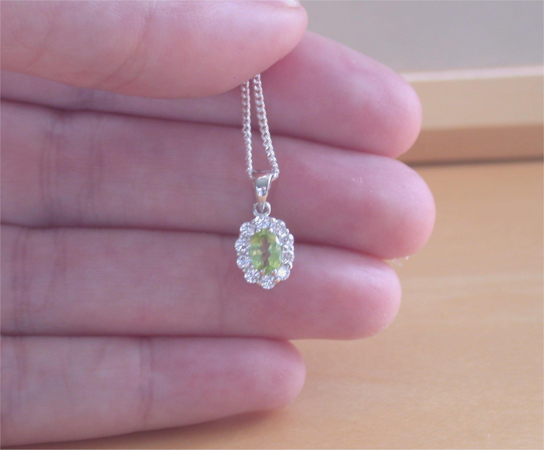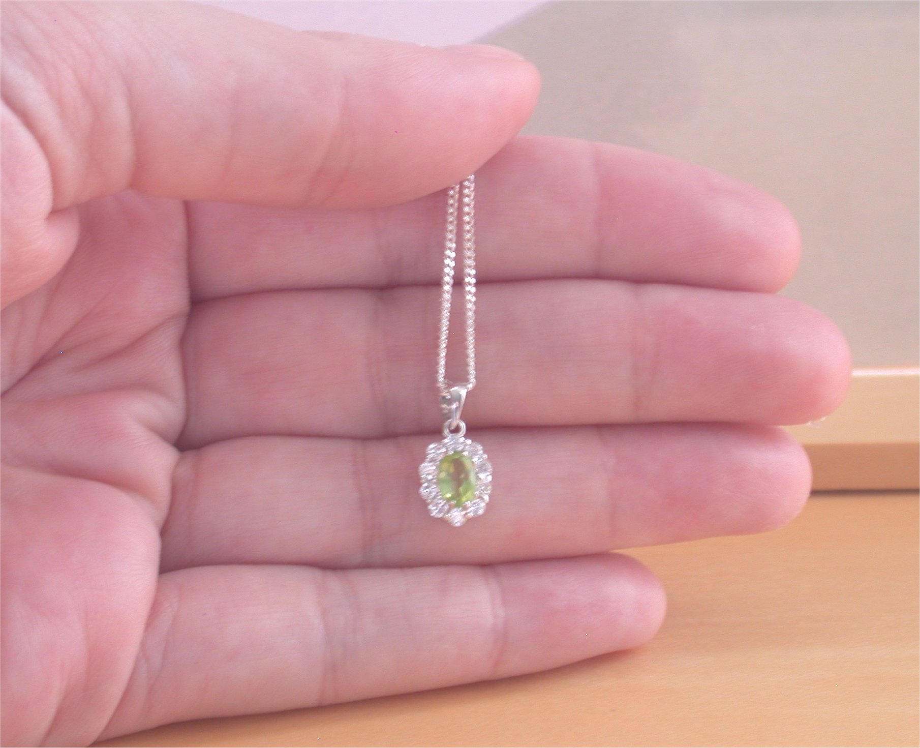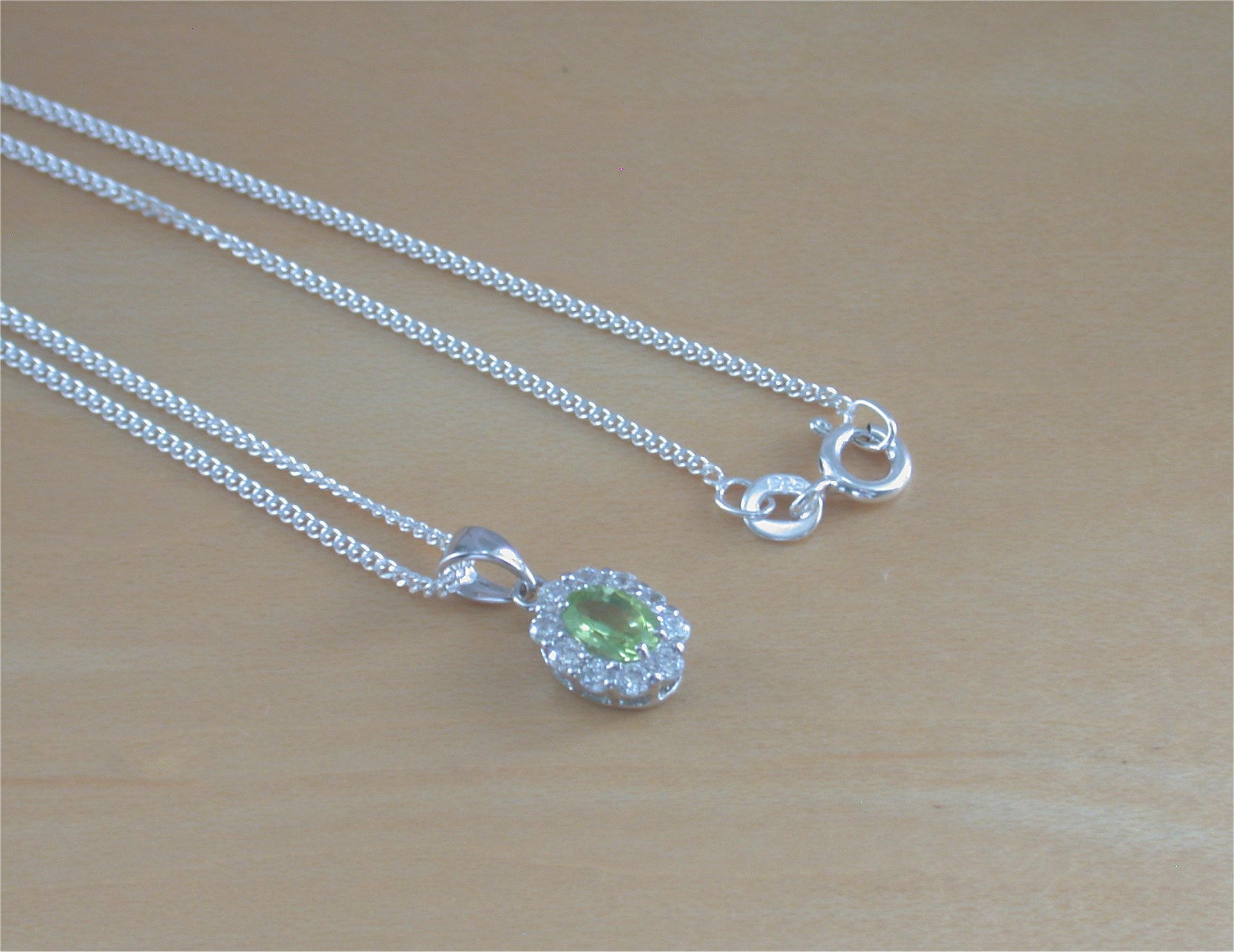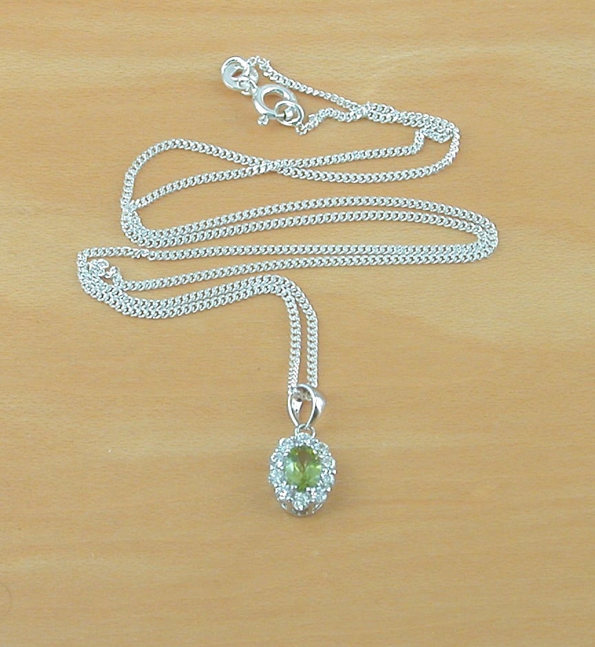 Sterling silver, oval design pendant set with genuine peridot gemstone and cz crystals. The pendant measures 10mm length x 8mm width. The peridot gemstone measures 6mm. This pendant will come complete with an 18 inch sterling silver curb chain. Stamped 925. Peridot is the birthstone for August.