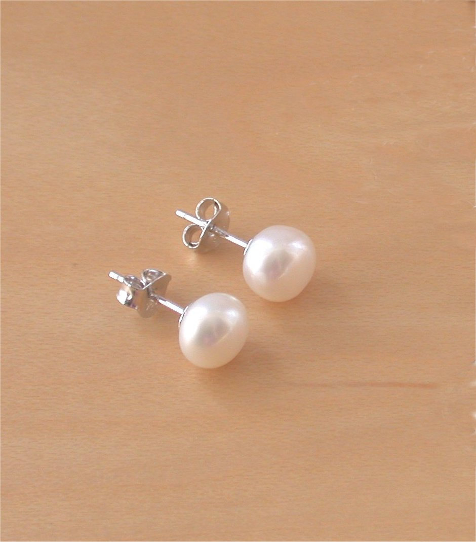 Sterling silver, white, freshwater pearl stud earrings. These pearl earrings measure 7mm. Stamped 925 on the back. Pearl is the birthstone for June.