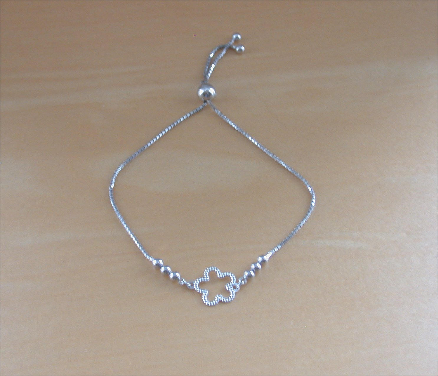 Sterling silver, flower detail, adjustable size bracelet. The bracelet can be adjusted to fit the smallest size wrist. Maximum length is 10 inches. The center flower measures 12mm x 12mm. The sterling silver beads measure 2mm. The bracelet is stamped 925.