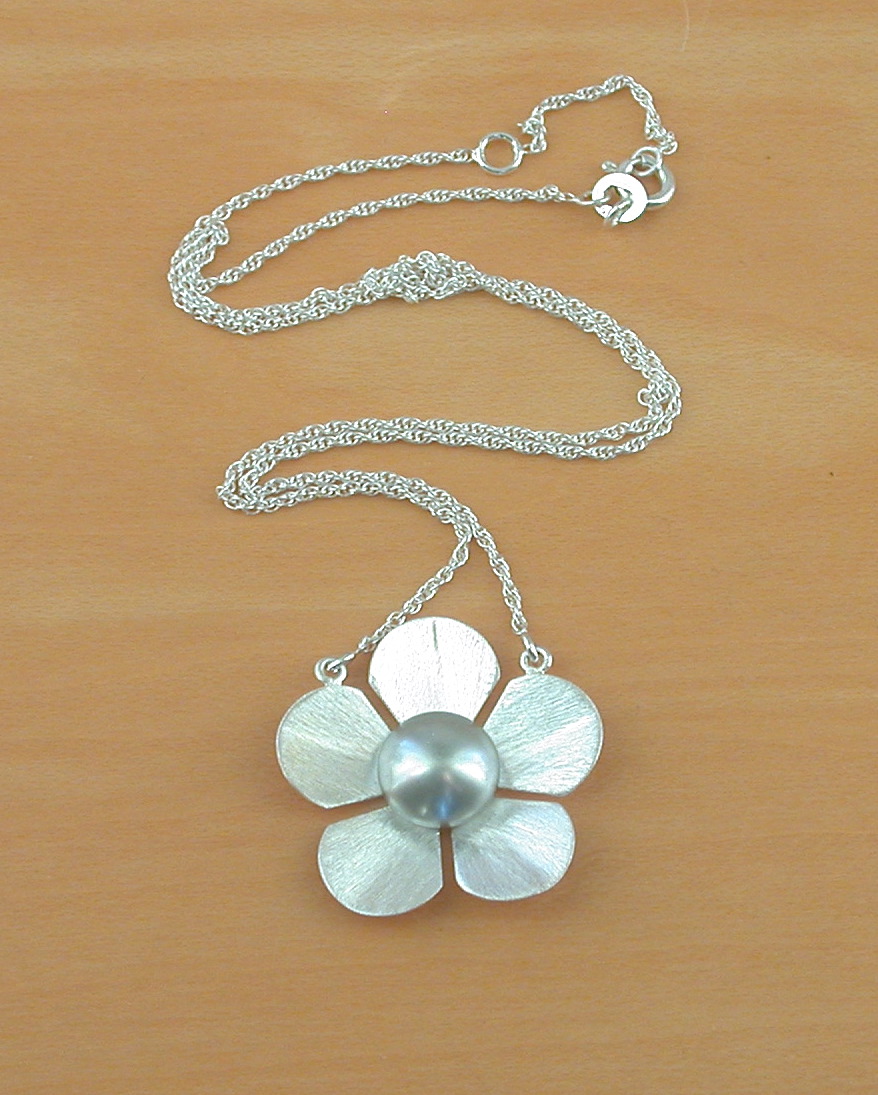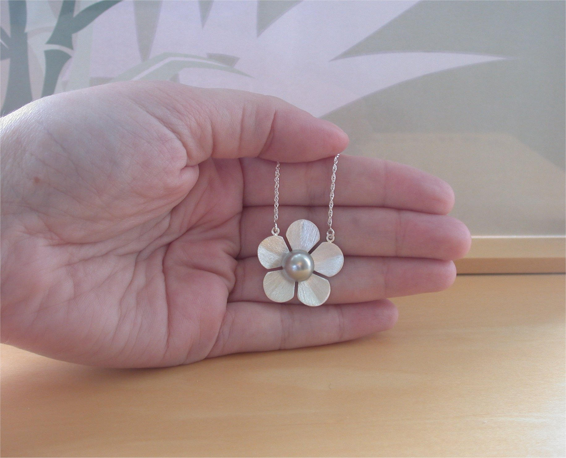 Sterling silver daisy flower necklace with faux grey pearl The flower measures 2.8cm width and 2.8cm length. The pearl center measures 10mm. This necklace measures 18 inches but can be shortened to 16 inches. A sturdy, sterling silver trigger clasp is attached. The necklace is stamped 925.