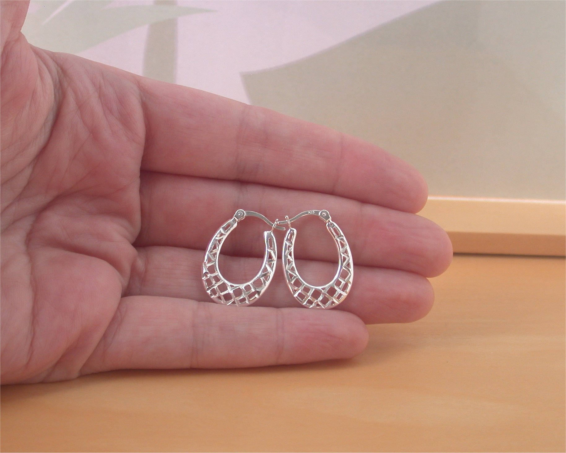 Sterling silver, lattice style, oval hoop earrings. Size 23mm in length x 15mm width. Hinged hook fastner. Both earrings are stamped 925.