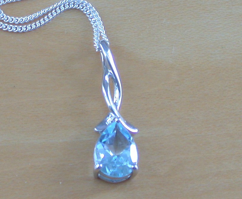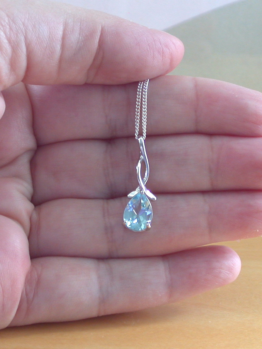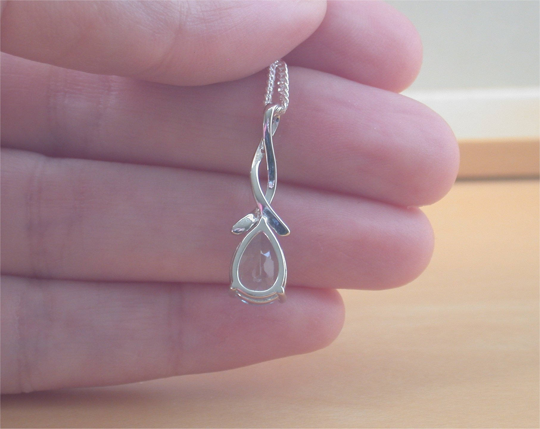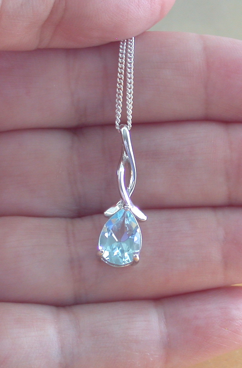 Sterling silver, twist design pendant with genuine blue topazpear cab gemstone. The pendant measures 25mm in height x 9mm width. The blue topaz gemstone measures 10mm height x 7mm width. This pendant will come complete with 18 inch sterling silver curb chain. (16, 20 & 22 inch chains now available, please leave message through checkout) Both the pendant and chain are stamped 925. Blue topaz is the birthstone for November.