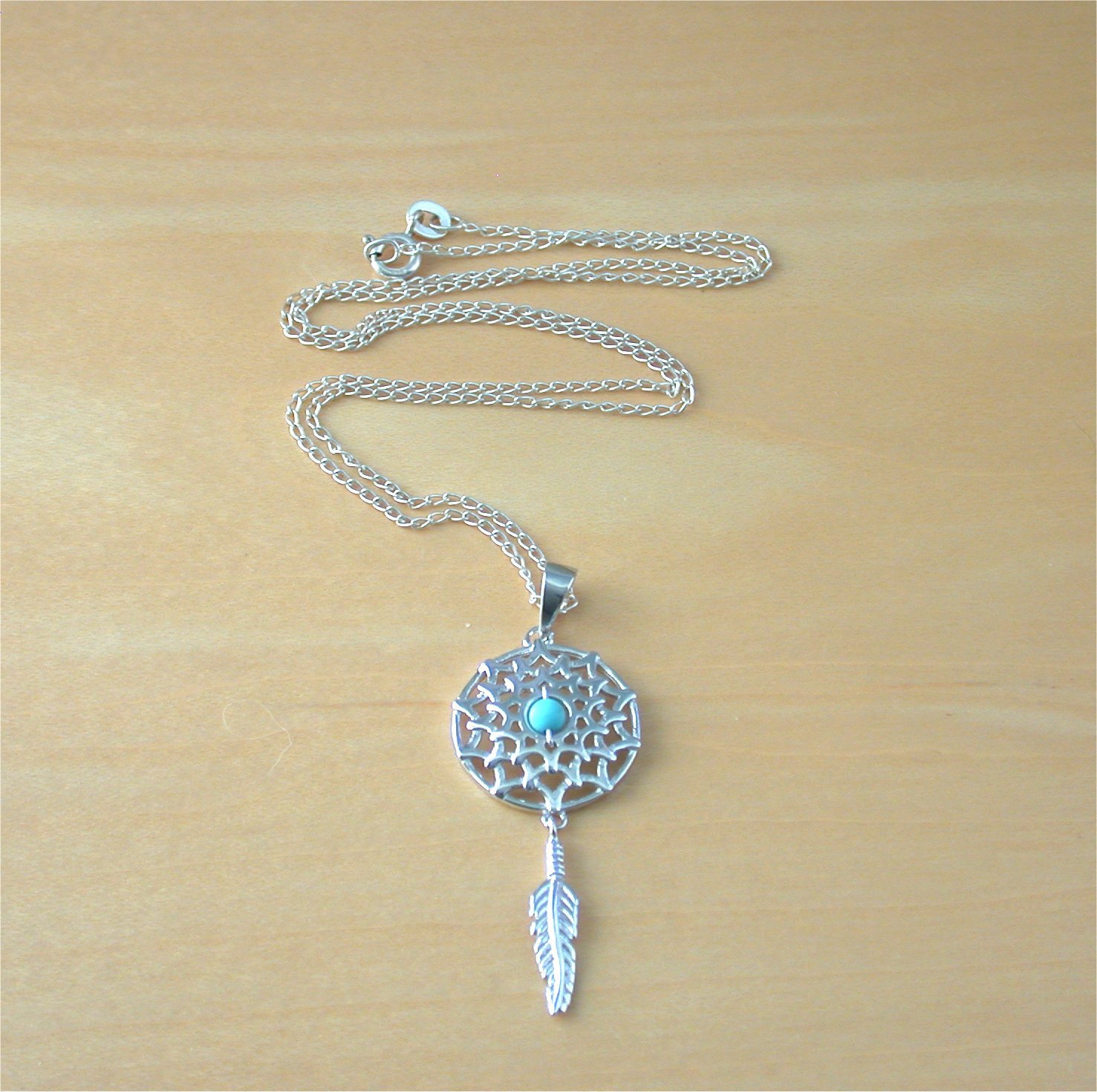 Sterling silver, dreamcatcher design pendant with turquoise bead detail. The pendant measures 4cm lengty x 1.8cm width. The bale measures 7mm x 3mm.The pendant will come complete with 18 inch chain (16 inch, 20 inch and 22inch chains are now available, please leave a note through checkout).. Both the pendant and chain are stamped 925 on the back.