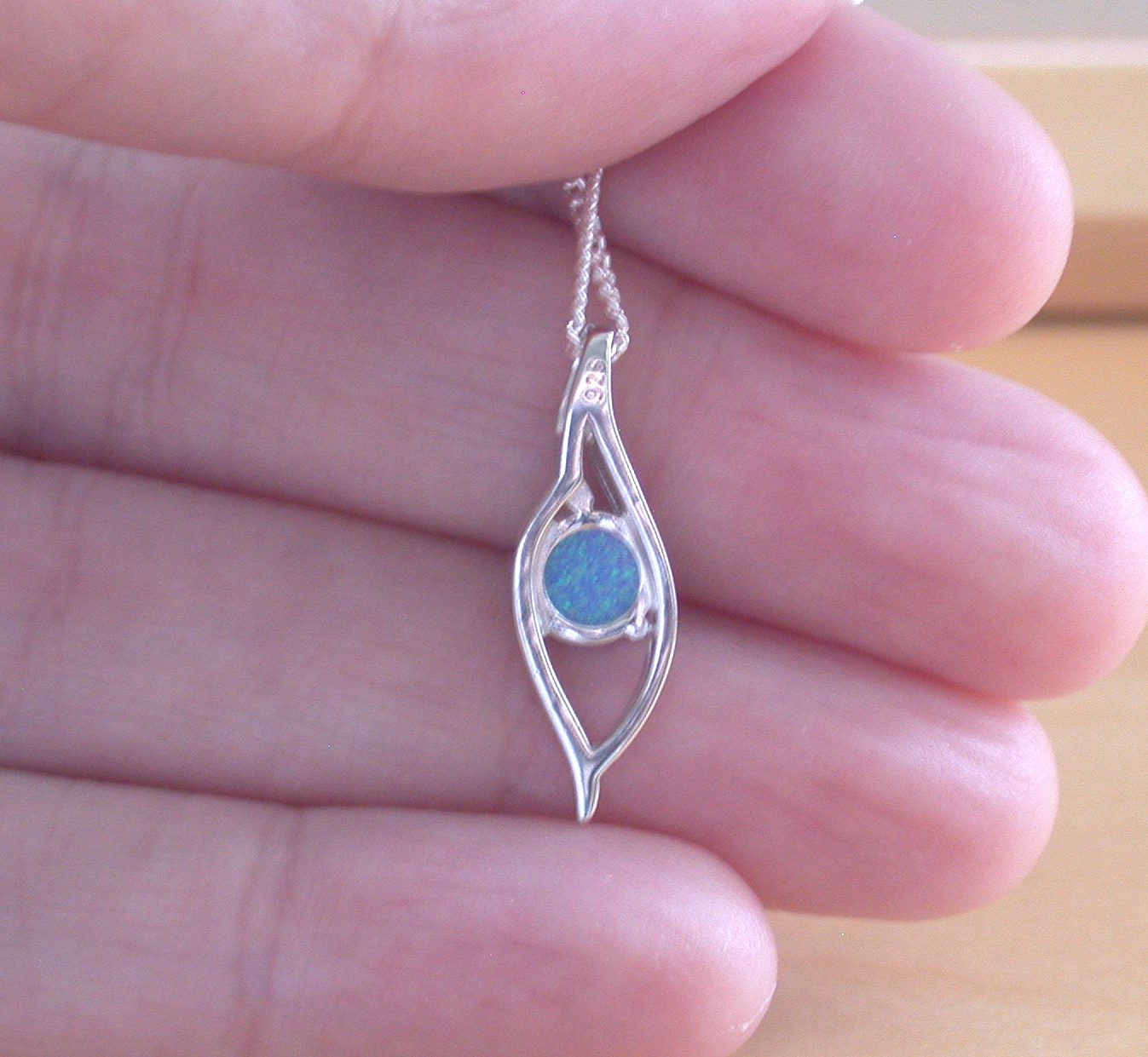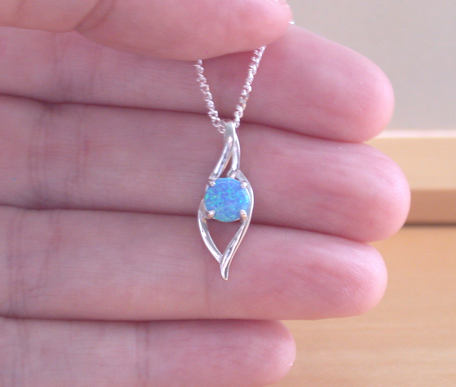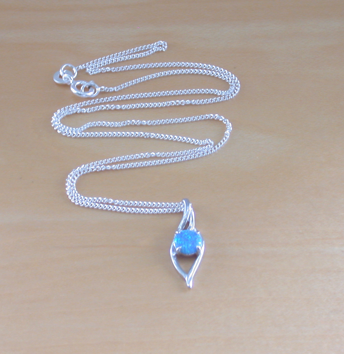 Sterling silver blue opal wave gemstone pendant with an 18 inch sterling silver curb chain (16 inch, 20 inch and 22 inch chains now available, please leave message through checkout). The pendant measures 22mm height x 8mm width. The opal gemstone measures 5mm.