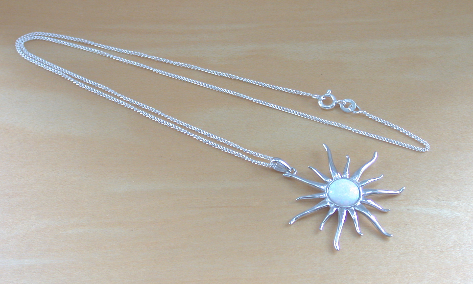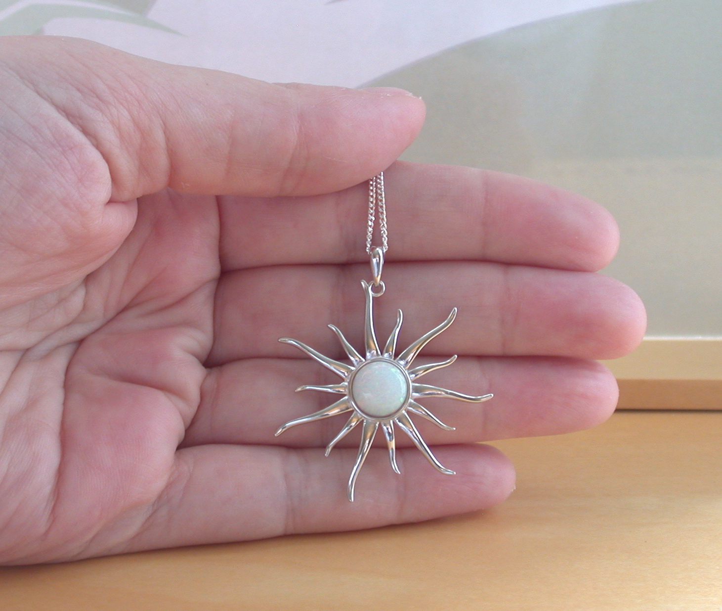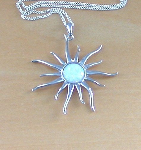 Sterling silver sun pendant with white opal gemstone. This pendant will come complete with 18 inch sterling silver flat curb chain (16 inch,20 inch and 22 inch chains now available, please leave message through checkout). The pendant measures 35mm height x 35mm width. The opal gemstone measures 9mm. Both pendant and chain are stamped 925.