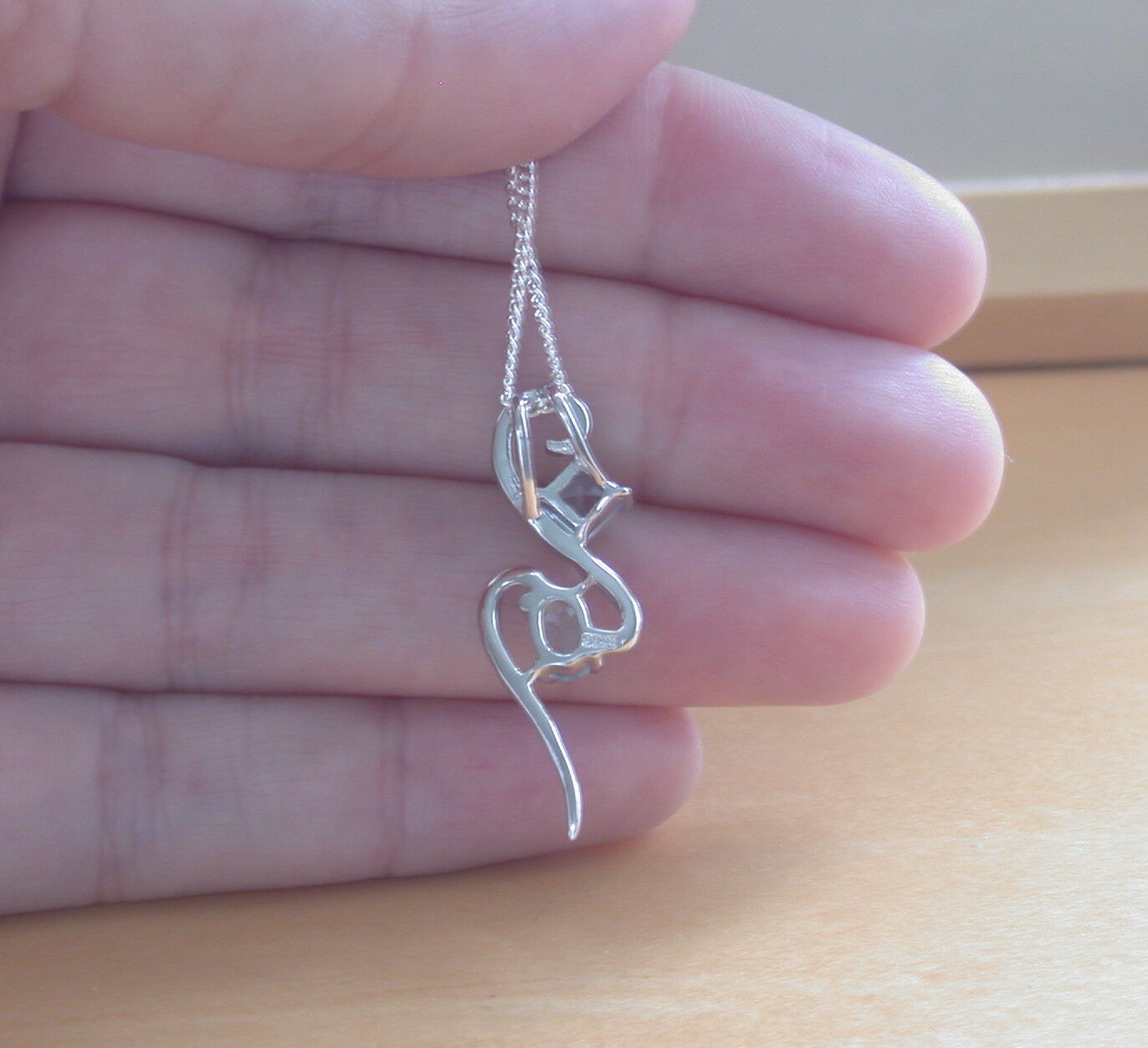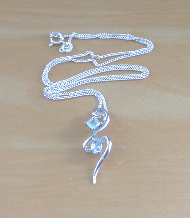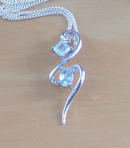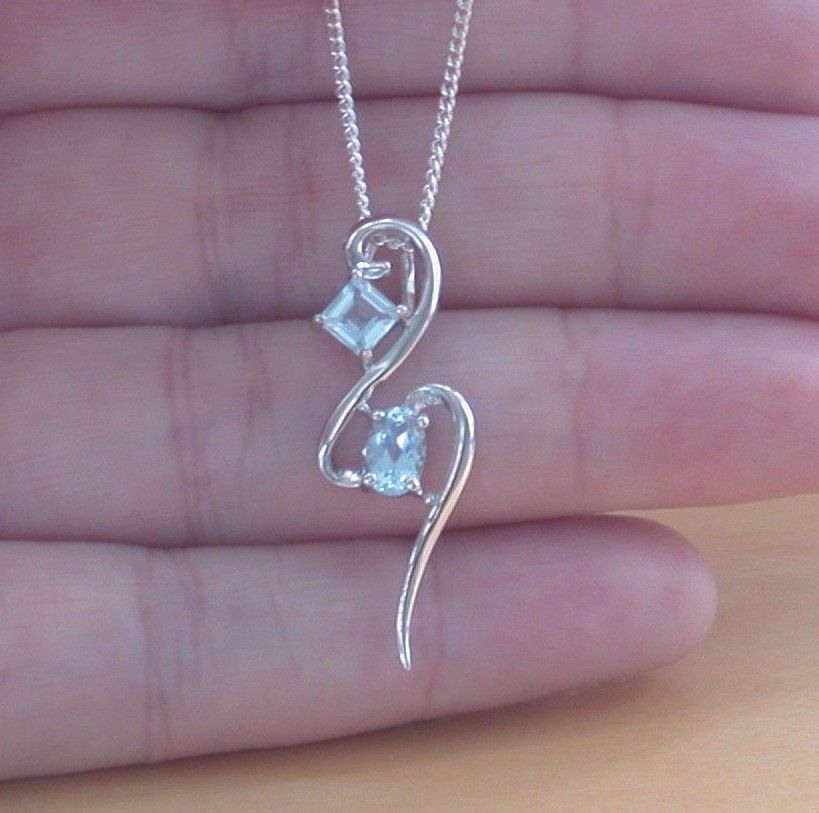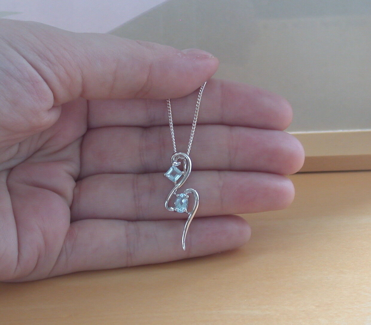 Sterling silver, s design pendant set with genuine blue topaz gemstone. The pendant measures 30mm height x 13mm width. The blue topaz oval gemstone measures 6mm x 4mm. The square topaz measures 4mm x 4mm. This pendant will come complete with 18 inch sterling silver curb chain (16, 20 and 22 inch chains now available, please leave message through checkout) Stamped 925. Topaz is the birthstone for November.