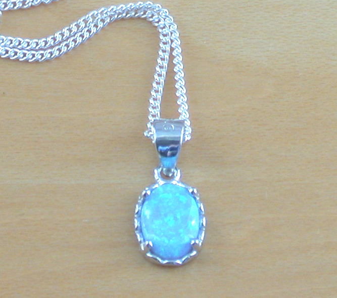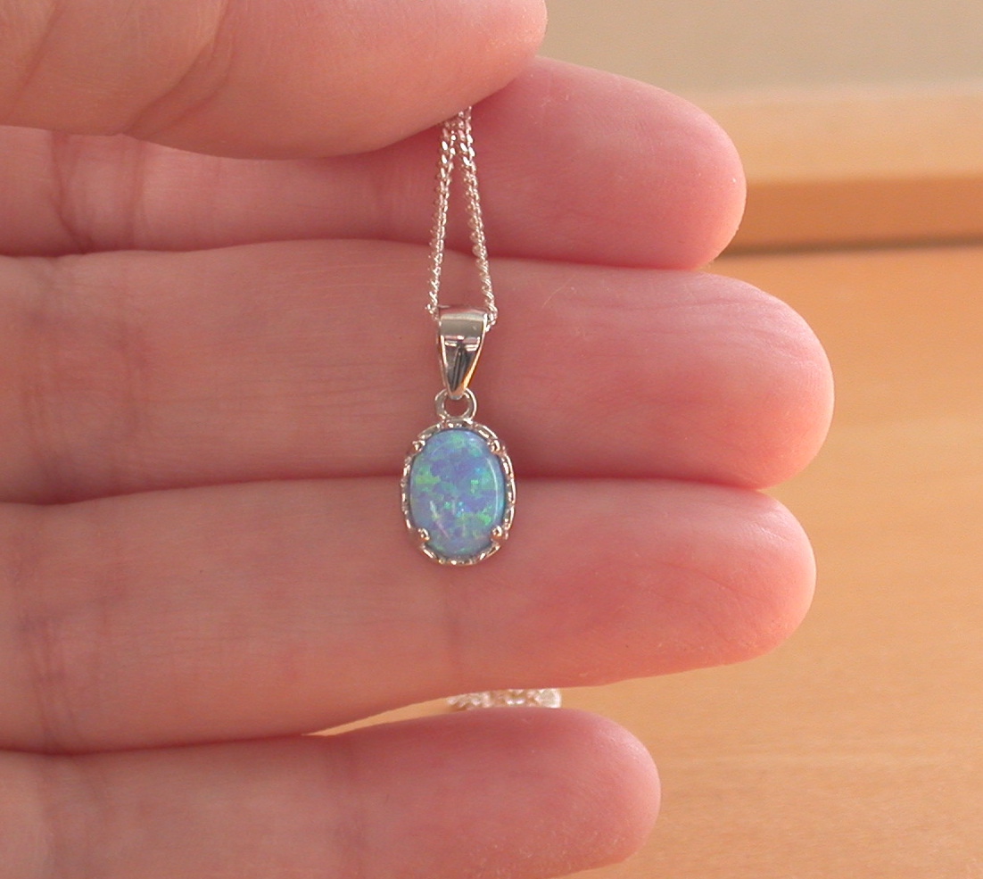Sterling silver oval pendant set with blue opal (lab created) gemstone. The pendant measures 17mm height x 6mm width (including bale). The opal gemstone measures 8mm x6mm. Stamped 925. Opal is the birthstone for October..