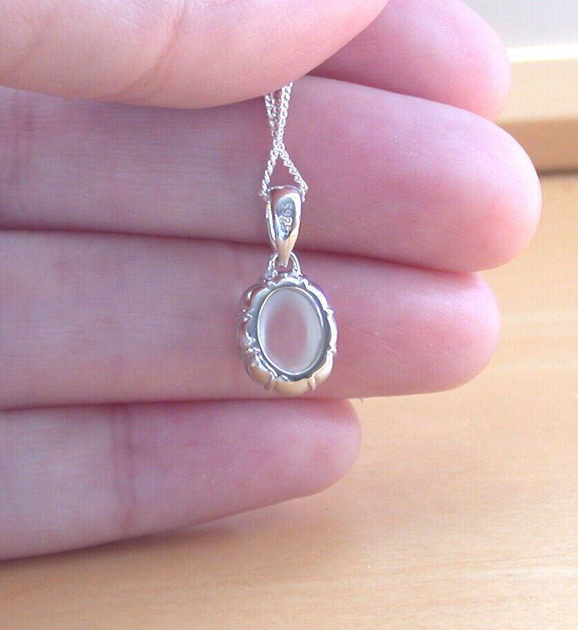 Sterling silver pendant set with oval moonstone gemstone. The pendant measures 10mm x 10mm. The centre gemstone measures 8mm. The bale measures 5mm in length. This pendant will come complete with a sterling silver chain. Stamped 925.
