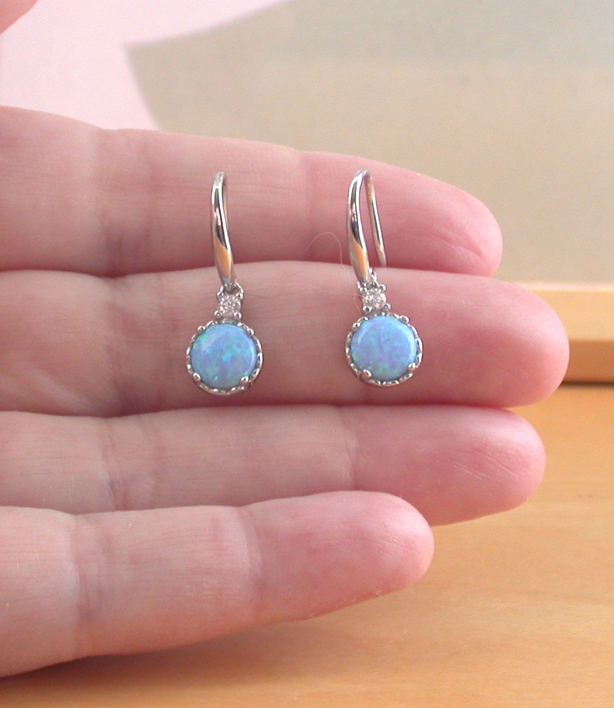 Sterling silver, blue opal (lab created)gemstone with Cz, drop earrings. These earrings measure 10mm height x 8mm width. Stamped 925. Opal is the birthstone for October.