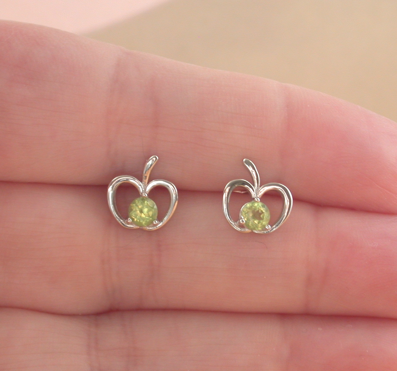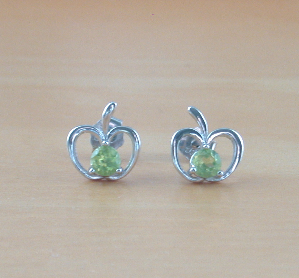 Sterling silver, apple design stud earrings, set with two genuine peridot gemstones. These earrings measure 10mm height x 10mm width. The centre gemstones measures 3mm in size. Stamped 925. Peridot is the birthstone for August.