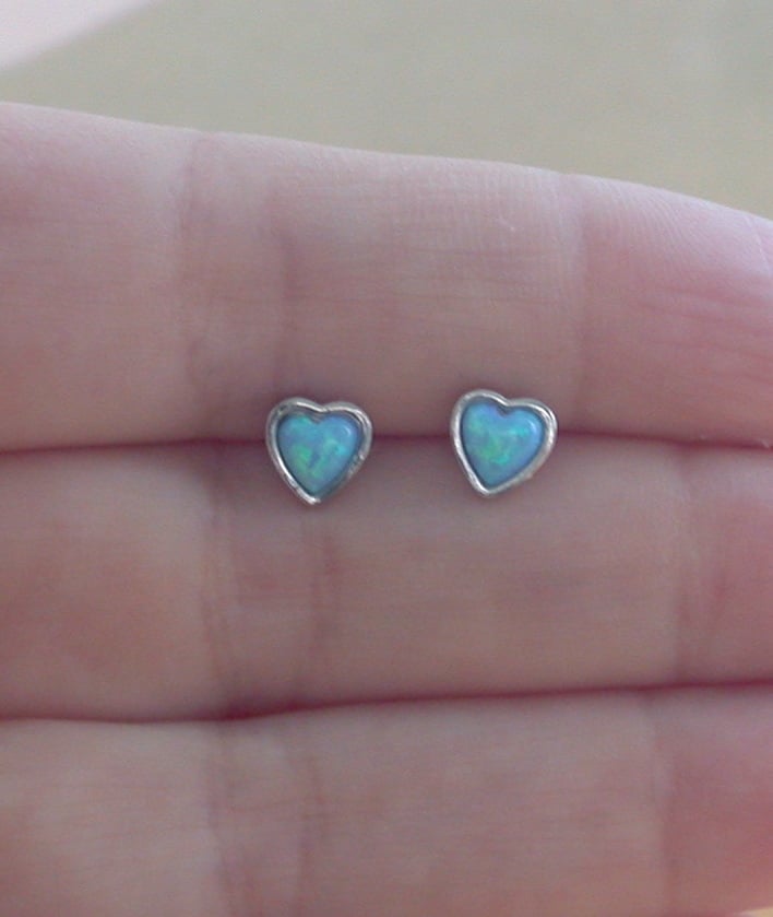 Sterling silver heart stud earrings with blue opal (lab created) gemstones. These earrings measure 5mm height x 5mm width. Stamped 925.