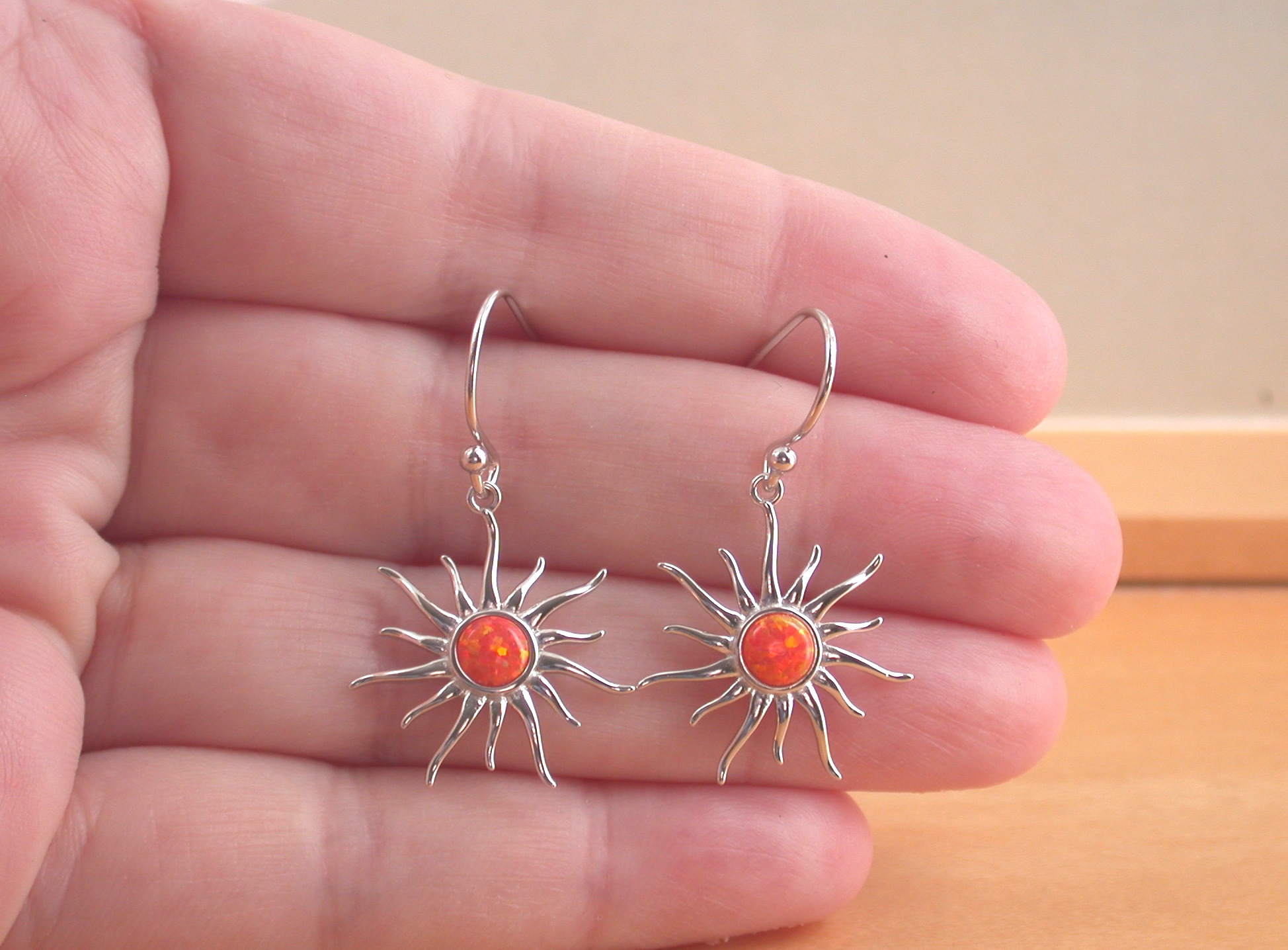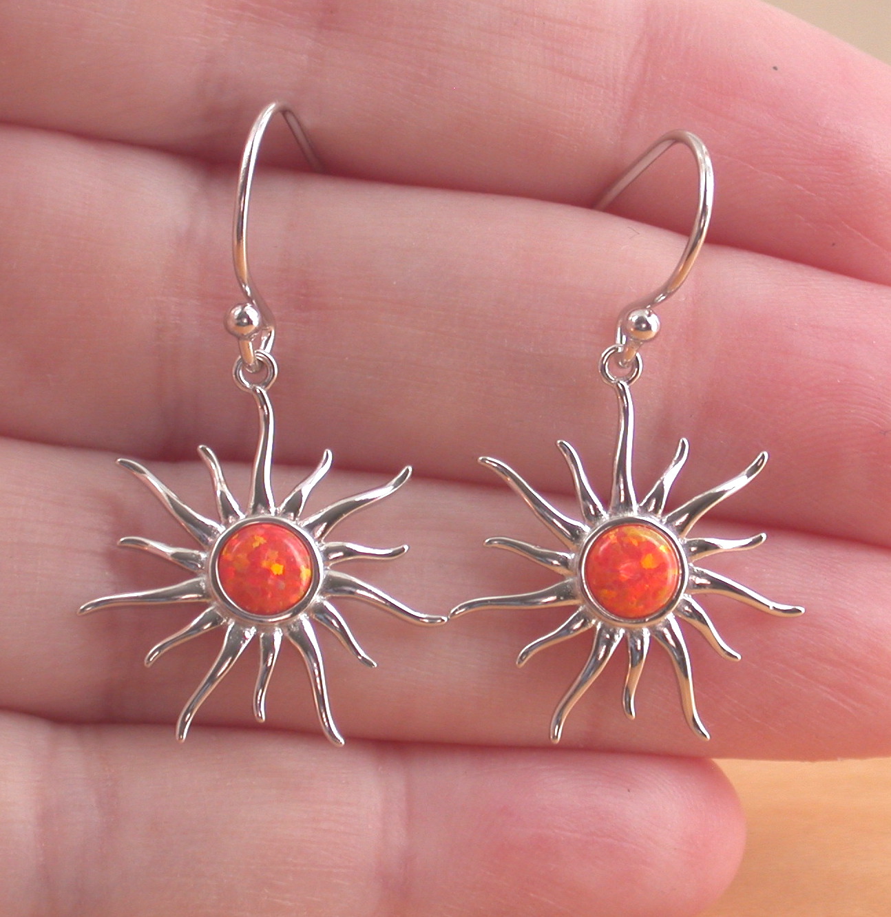 Sterling Silver fire opal sun earrings set with orange opal gemstones. These earrings measure 20mm length x 20mm width. The opal gemstone measures 4mm. Both earrings are stamped 925. The fire opal gemstone is produced by synthesising the silica beads that form natural opal. Opal is the birthstone for October.