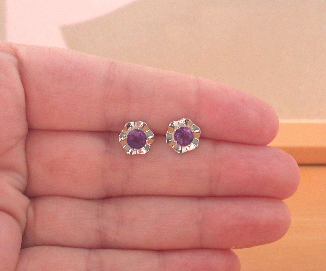 Sterling silver flower stud earrings with genuine amethyst gemstones. These earrings measure 10mm height x 10mm width. The amethyst gemstone in the centre measures 5mm. Stamped 925. Amethyst is the birthstone for February.