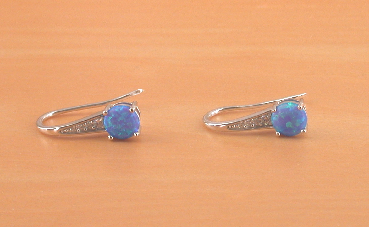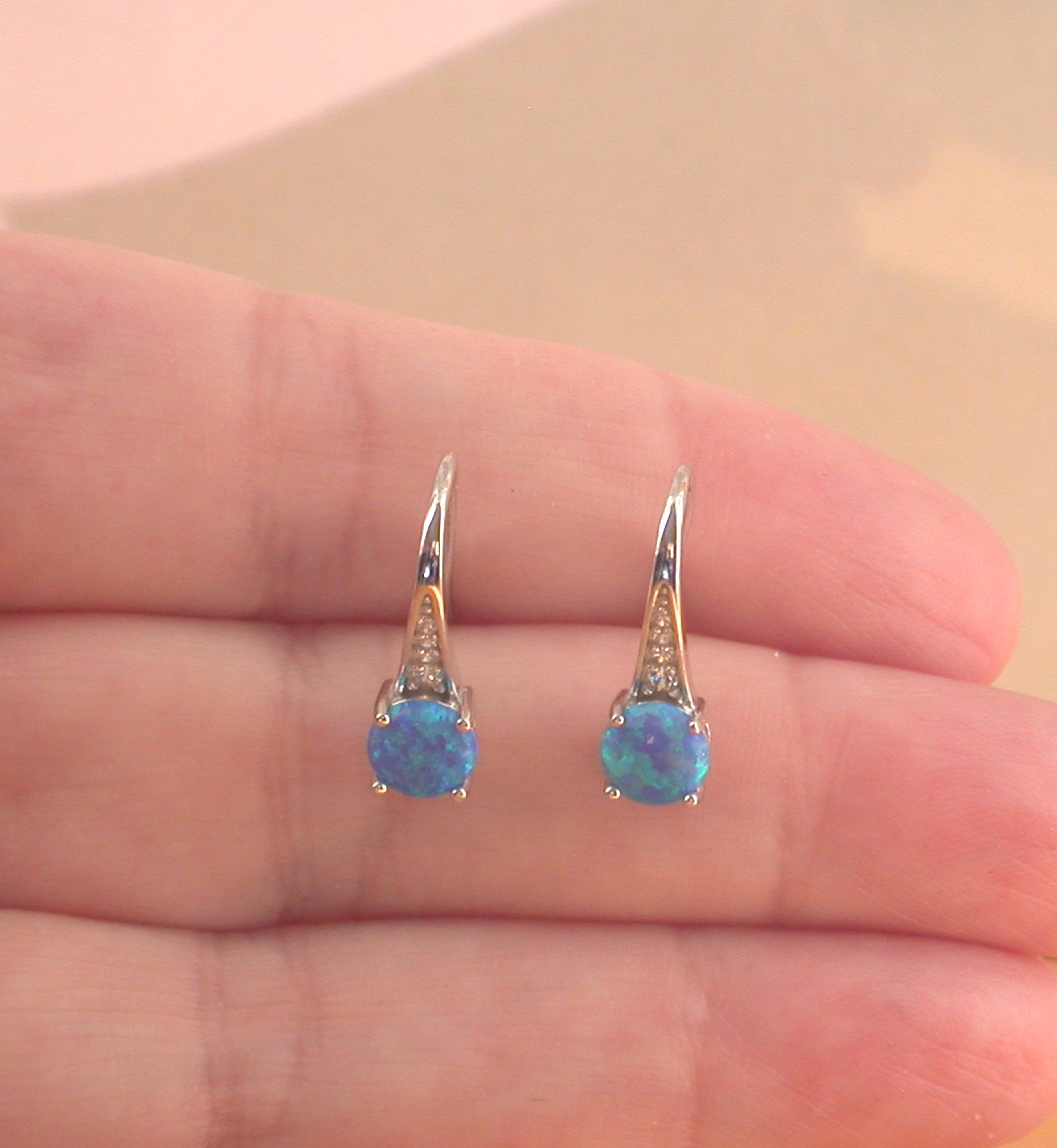 Sterling silver, blue opal (lab created)gemstone with Cz, hook earrings. These earrings measure 13mm height x 6mm width. Blue opal gemstones measure 5mm. Stamped 925. Opal is the birthstone for October.