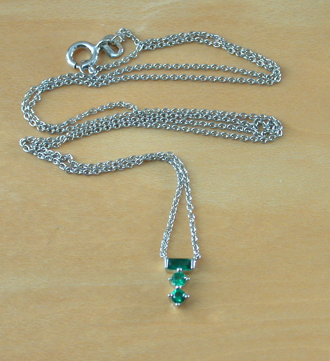Sterling silver necklace set with emerald (lab created) gemstone necklace. The necklace measures measures 18 inches in length. The centre emerald gemstone centre measures 9mm x 4mm. Stamped 925. Emerald is the birthstone for May.