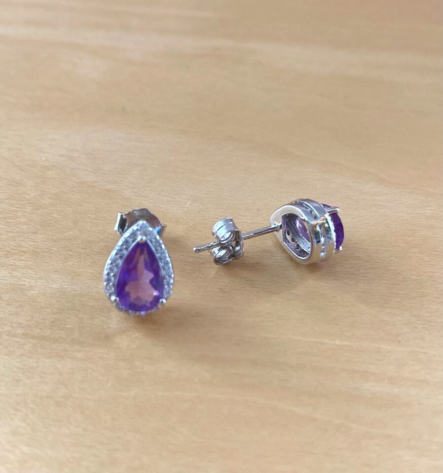 Sterling silver amethyst (natural) gemstone & cz stud earrings. These earrings measure 10mm height x 7mm width. Stamped 925. Amethyst is the birthstone for February.