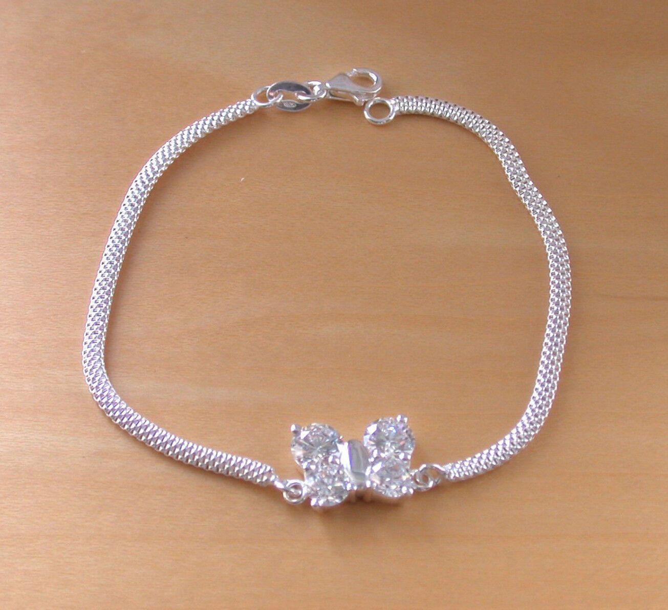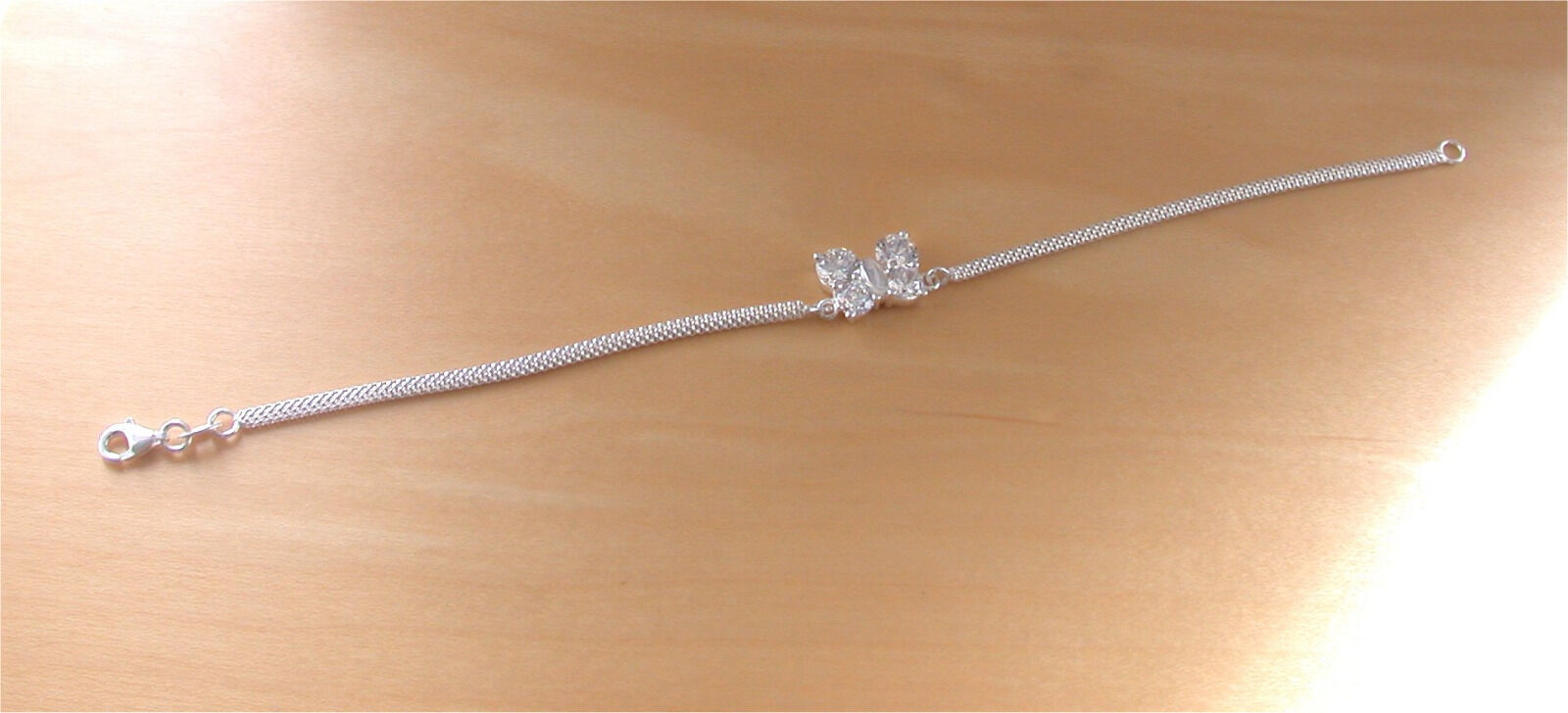 Sterling silver bracelet with crystal zirconia butterfly centerpiece. The bracelet measures 7.5 inches in length (19cm) and has a sturdy sterling silver lobster clasp. The centre crystal butterfly measures 15mm x 10mm. The bracelet measures 7.5 inches in length and has a sturdy lobster style clasp. The bracelet is stamped 925.
