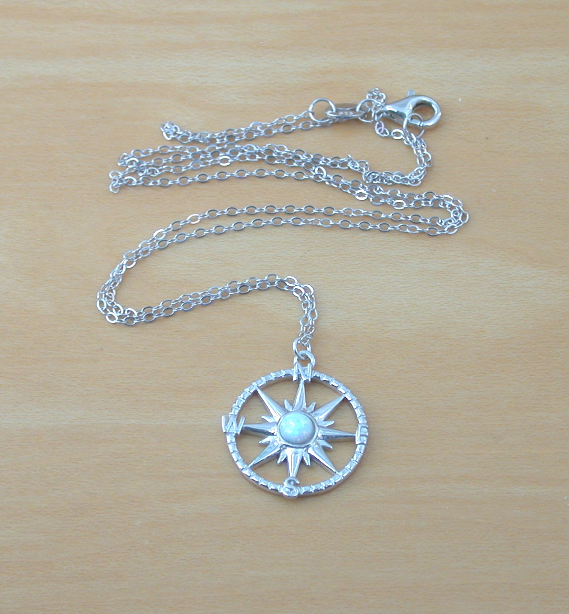 Sterling silver white opal (lab created) gemstone, compass necklace. The necklace measures 18 inches in length. The compass measures 17mmm x 17mm. The centre white opal gemstone measures 3mm. Stamped 925. Opal is the birthstone for October.