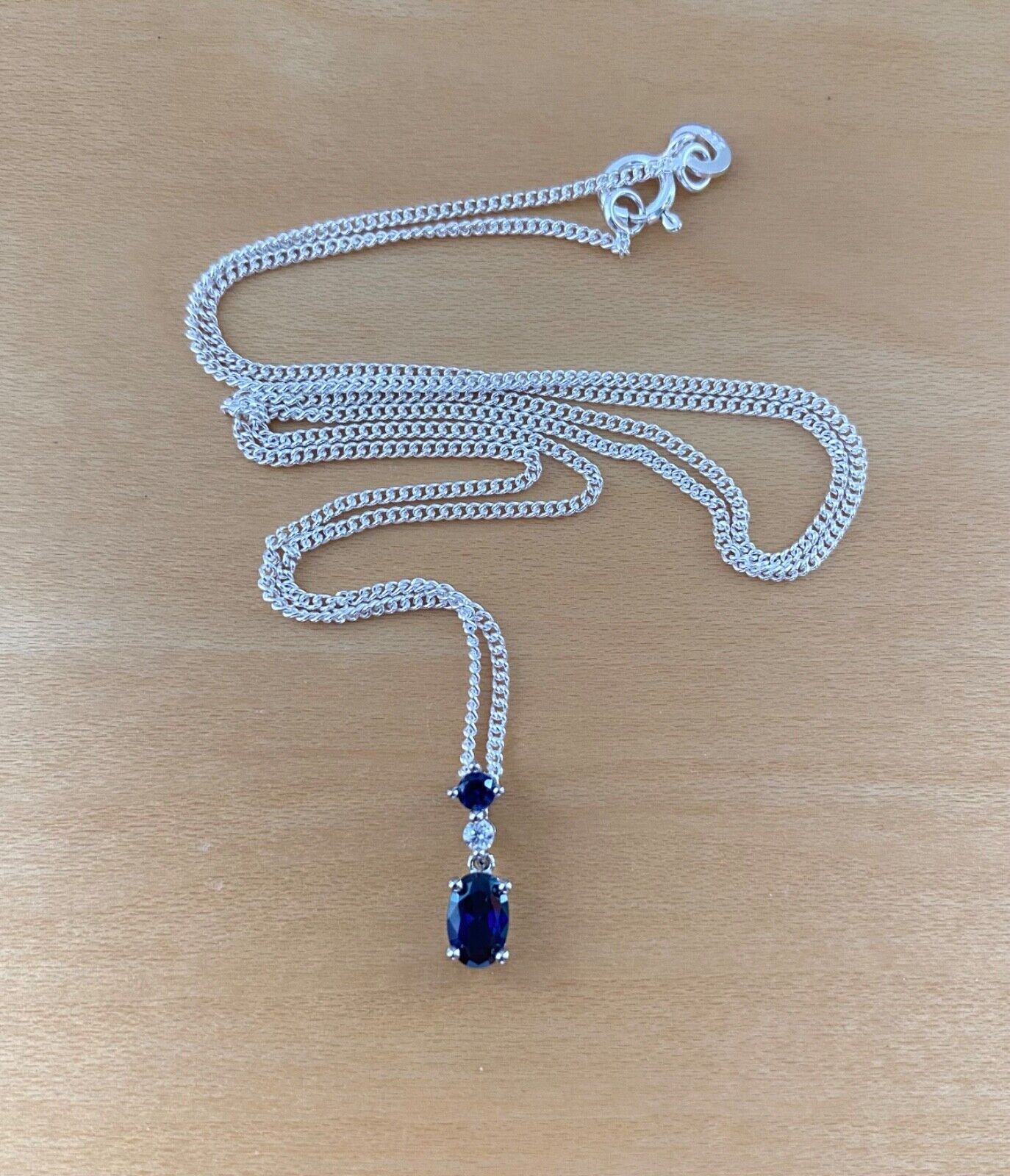 Sterling Silver Sapphire & Cz Pendant & Chain/Sapphire Necklace/Sapphire Jewellery/Sapphire Jewelry/Gemstone Necklace/September Birthstone/UK