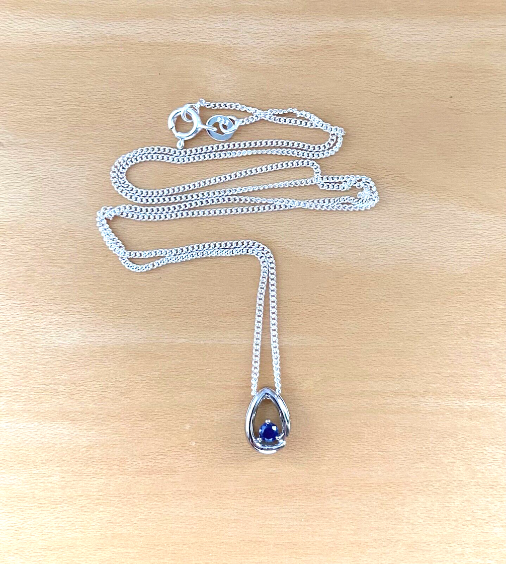 Sterling silver sapphire (lab created) gemstone teardrop pendant. The pendant measures 10mm height x 7mm width.This pendant comes complete with an 18 inch sterling silver chain. Stamped 925. Sapphire is the birthstone for September.