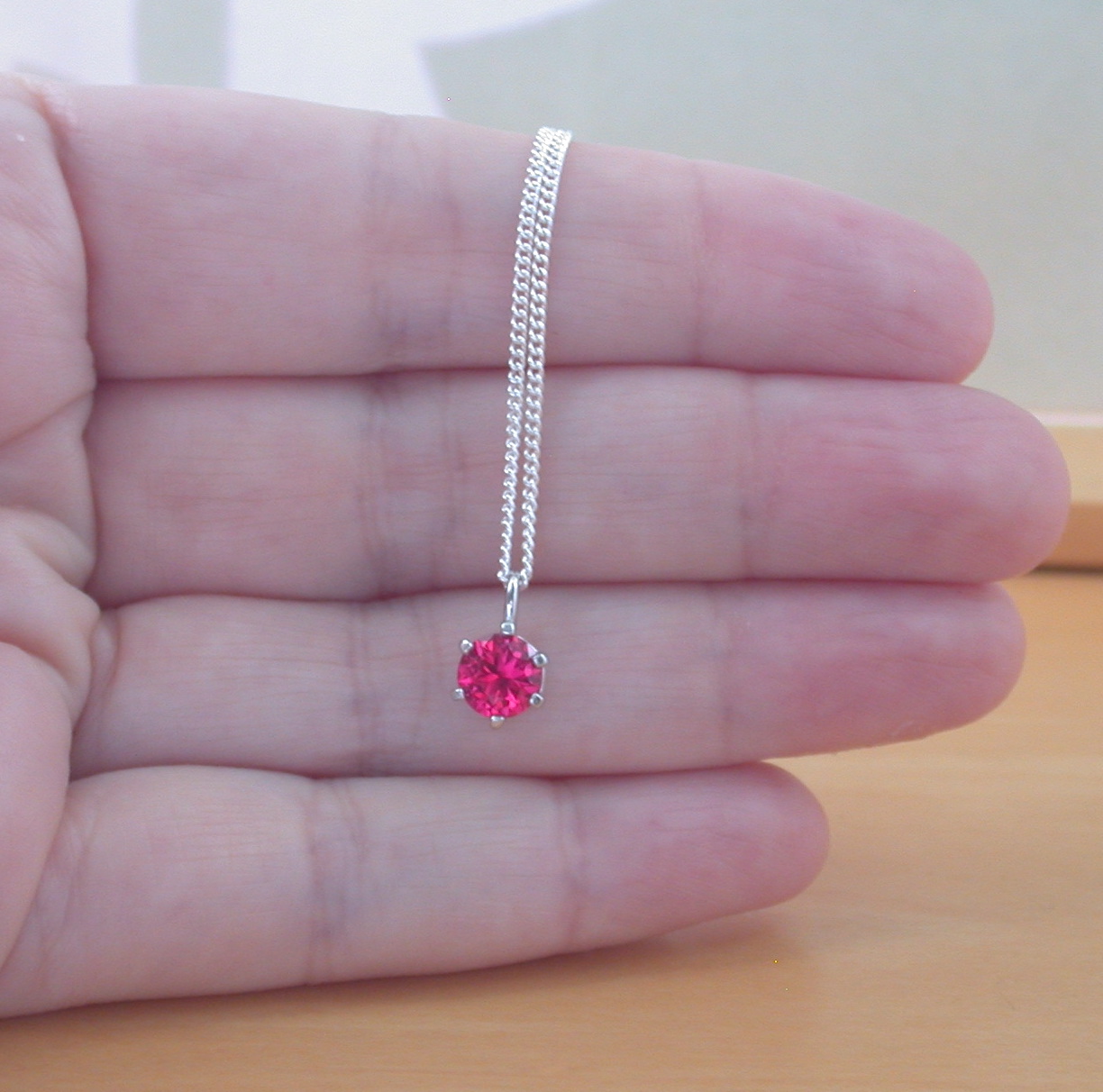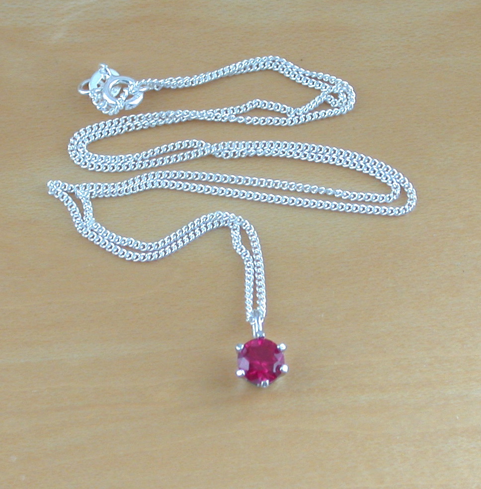 Sterling silver and ruby (lab created) solitaire gemstone pendant, chain and earring set. This pendant measures 1cm length x 7mm width (including the bale). The centre ruby stone measures 4mm. Stamped 925 on the back. The sterling silver ruby stud earrings measure 6mm. Ruby is the birthstone for July.