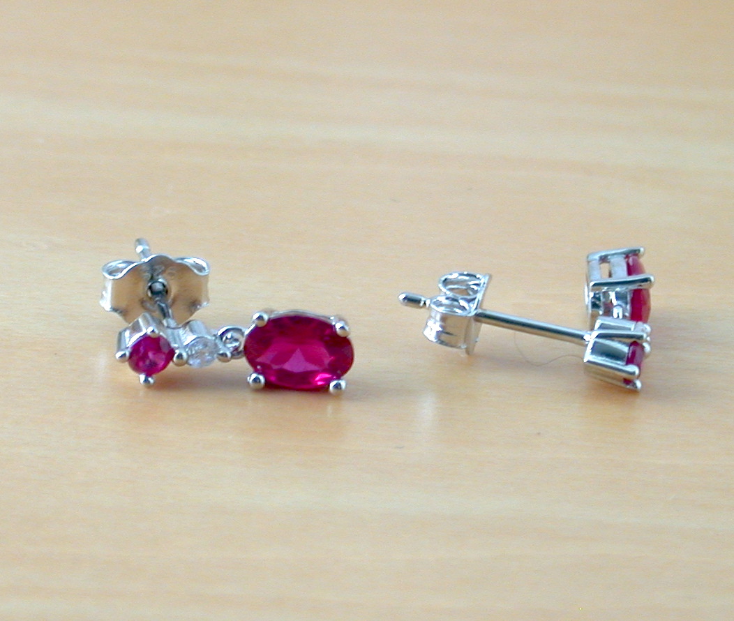 Sterling silver pendant set with ruby (lab created) & Cz gemstone. This pendant measures 12mm height x 4mm width. These ruby & cz earrings measure 13mm height x 6mm width. Stamped 925. Ruby is the birthstone for July.