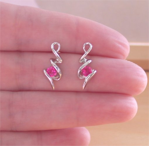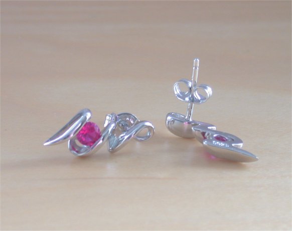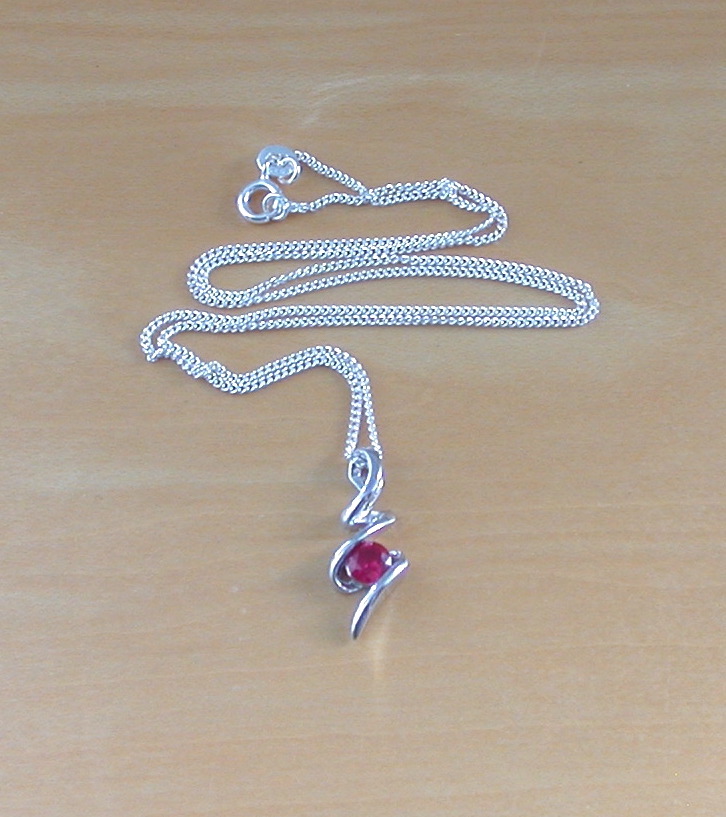 Sterling silver, ruby (lab created) gemstone squiggle pendant, chain and ruby earrings. This pendant measures 2.3cm length x 9mm width (including the bale). The centre ruby stone measures 5mm. Stamped 925 on the back. The earrings measure 19mm height x 7mm width. Ruby is the birthstone for July.