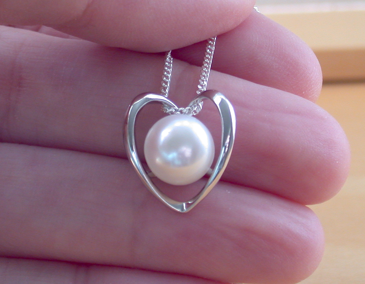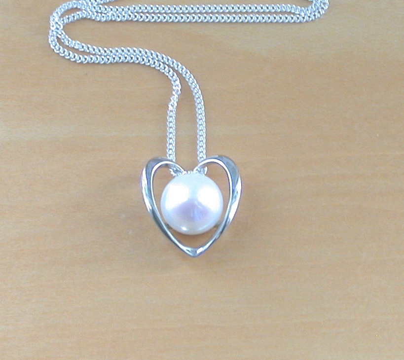 Sterling silver white freshwater pearl heart design pendant, chain and earring set. The pendant comes complete with an 18 inch sterling silver chain. The pendant measures 16mm length x 15mm width. The centre pearl measures 10mm. Stamped 925 on the back. The sterling silver freshwater pearl earrings measure 12mm x 10mm. The center pearl measures 7mm. Stamped 925 on the back. Pearl is the birthstone for June.