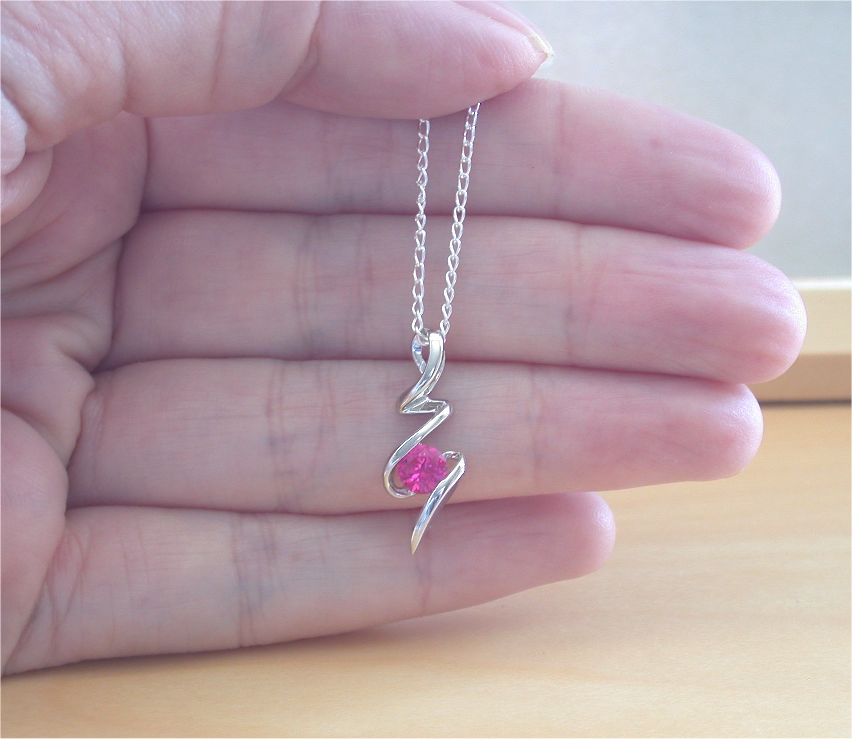 Sterling silver, ruby (lab created) gemstone squiggle pendant, chain and ruby earrings. This pendant measures 2.3cm length x 9mm width (including the bale). The centre ruby stone measures 5mm. Stamped 925 on the back. The sterling silver round stud earrings measure 4mm. Ruby is the birthstone for July.