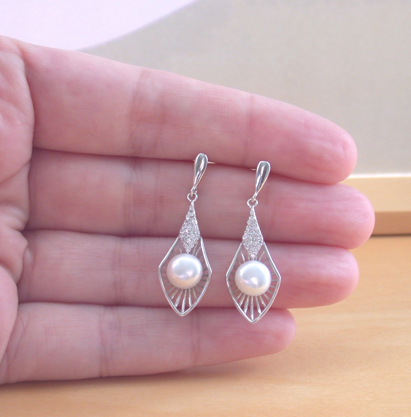 Sterling silver, white freshwater pearl and Cz earrings. These earrings measure 25mm length x 14mm width. The centre pearls measure 9mm. Stamped 925. Pearl is the birthstone for June.