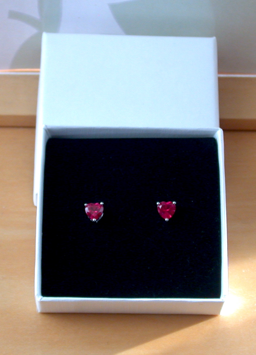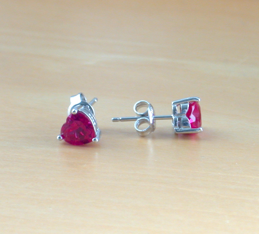 Sterling silver earrings set with ruby (lab created) heart gemstones. Each earring measures 5mm height x 6mm width. Stamped 925. Ruby is the birthstone for July.
