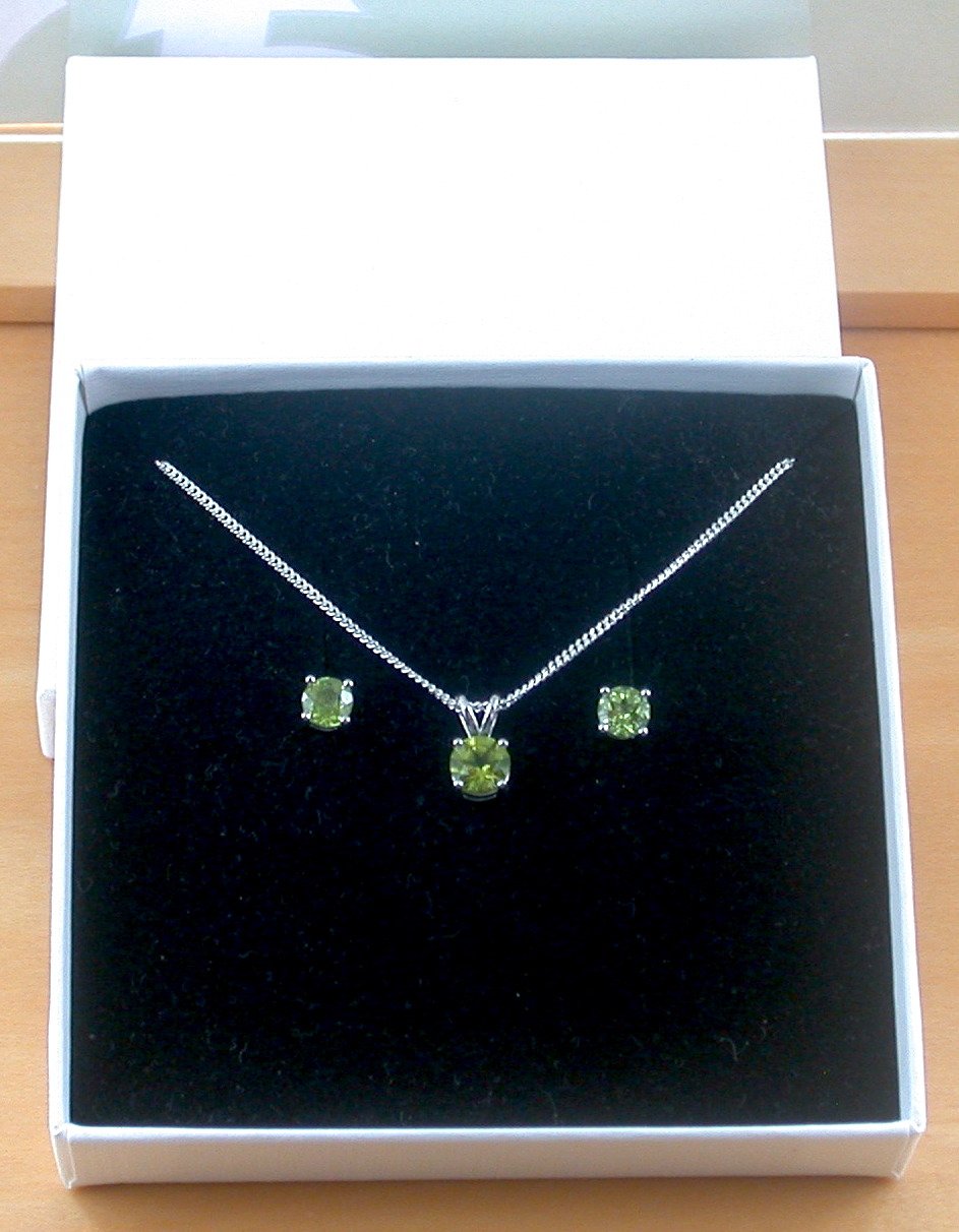 This pendant, chain and earrings will come complete with presentation gift box and bag and will include a peridot gemstone description gift card below.