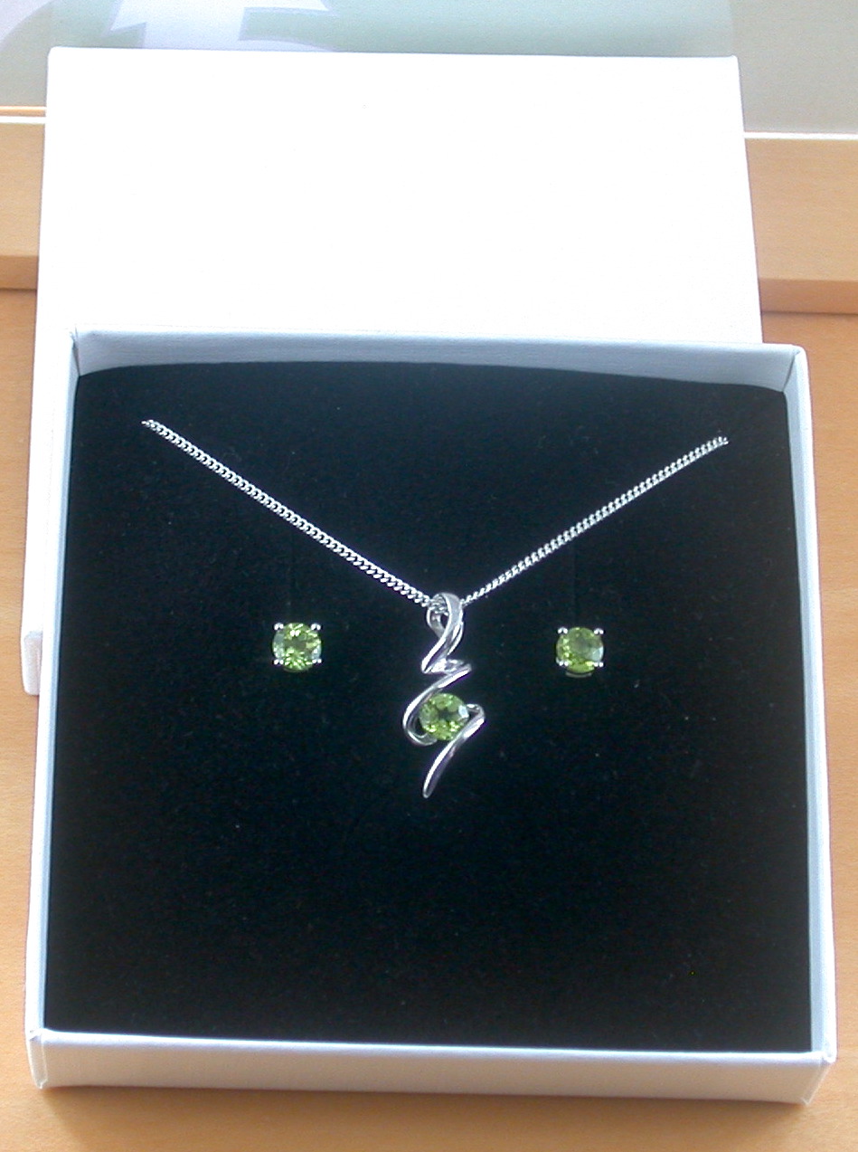 This pendant, chain and earrings will come complete with presentation gift box and bag and will include a peridot gemstone description gift card below.