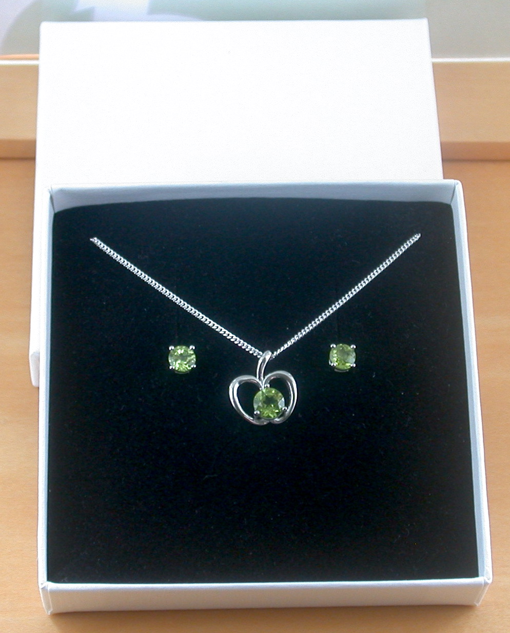 This pendant, chain and earrings will come complete with presentation gift box and bag and will include a peridot gemstone description gift card below.