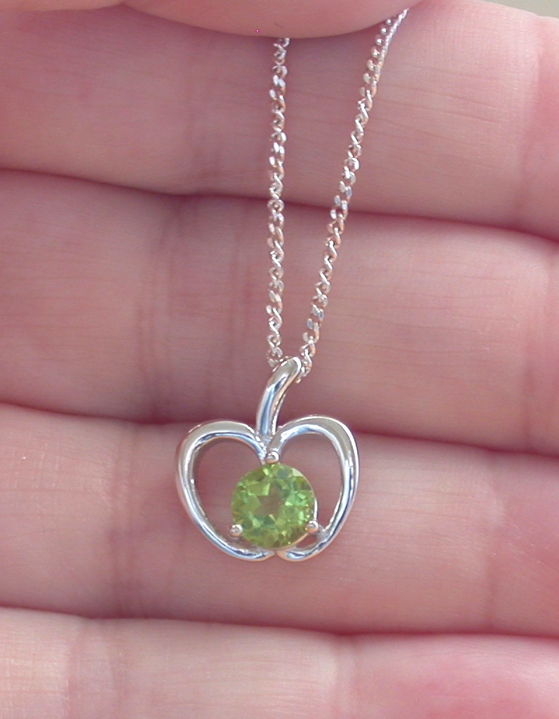 Sterling silver, apple design pendant set with genuine peridot gemstone. The pendant measures 15mm length x 13mm width. The peridot gemstone measures 5mm. This pendant will come complete with an 18 inch sterling silver curb chain. Stamped 925. The peridot stud earrings measure 5mm. The centre gemstones measures 3mm in size. Peridot is the birthstone for August.