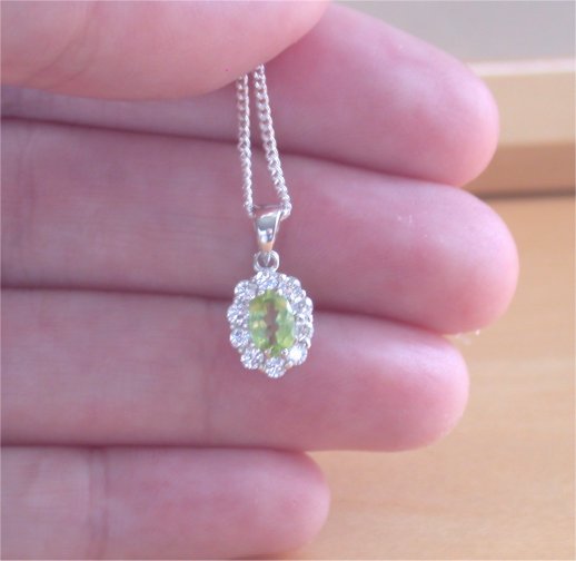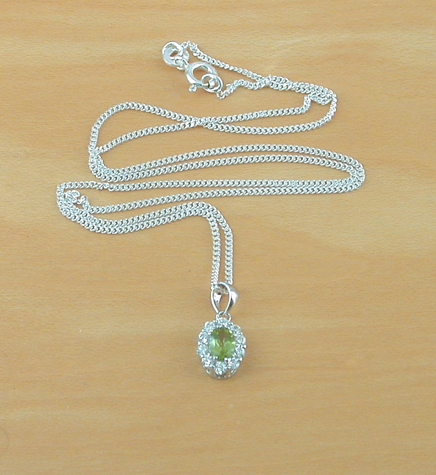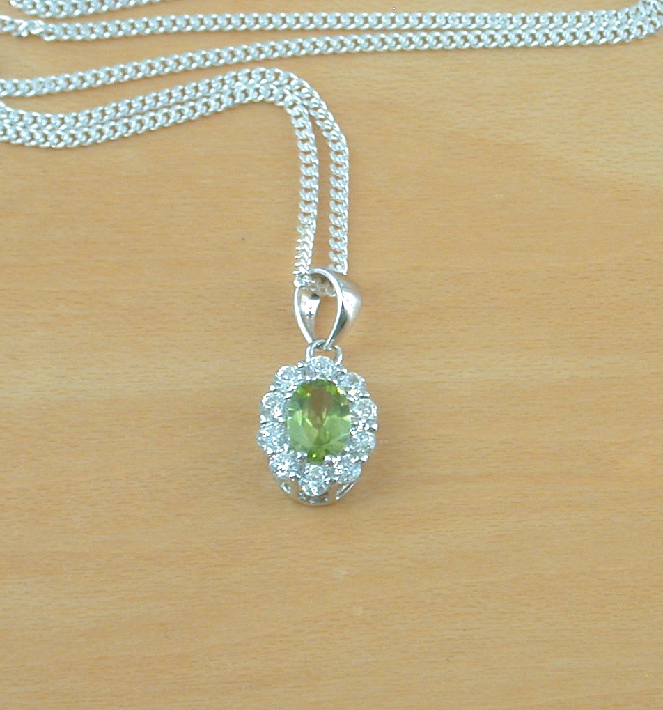 Sterling silver, oval design pendant set with genuine peridot gemstone and cz crystals, sterling silver chain and matching earrings. The pendant measures 10mm length x 8mm width. The peridot gemstone measures 6mm. This pendant will come complete with an 18 inch sterling silver curb chain. The sterling silver stud earrings measure 5mm. The peridot gemstone measures 5mm. Peridot is the birthstone for August.