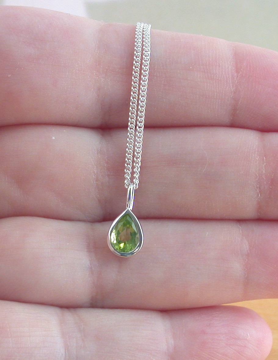 Sterling silver, peridot gemstone, teardrop pendant. This pendant measures 12mm length x 6mm width (including the bale). The centre peridot stone measures 7mm x 5mm. This pendant will come complete with an 18 inch sterling silver curb chain. Stamped 925. Peridot is the birthstone for August.