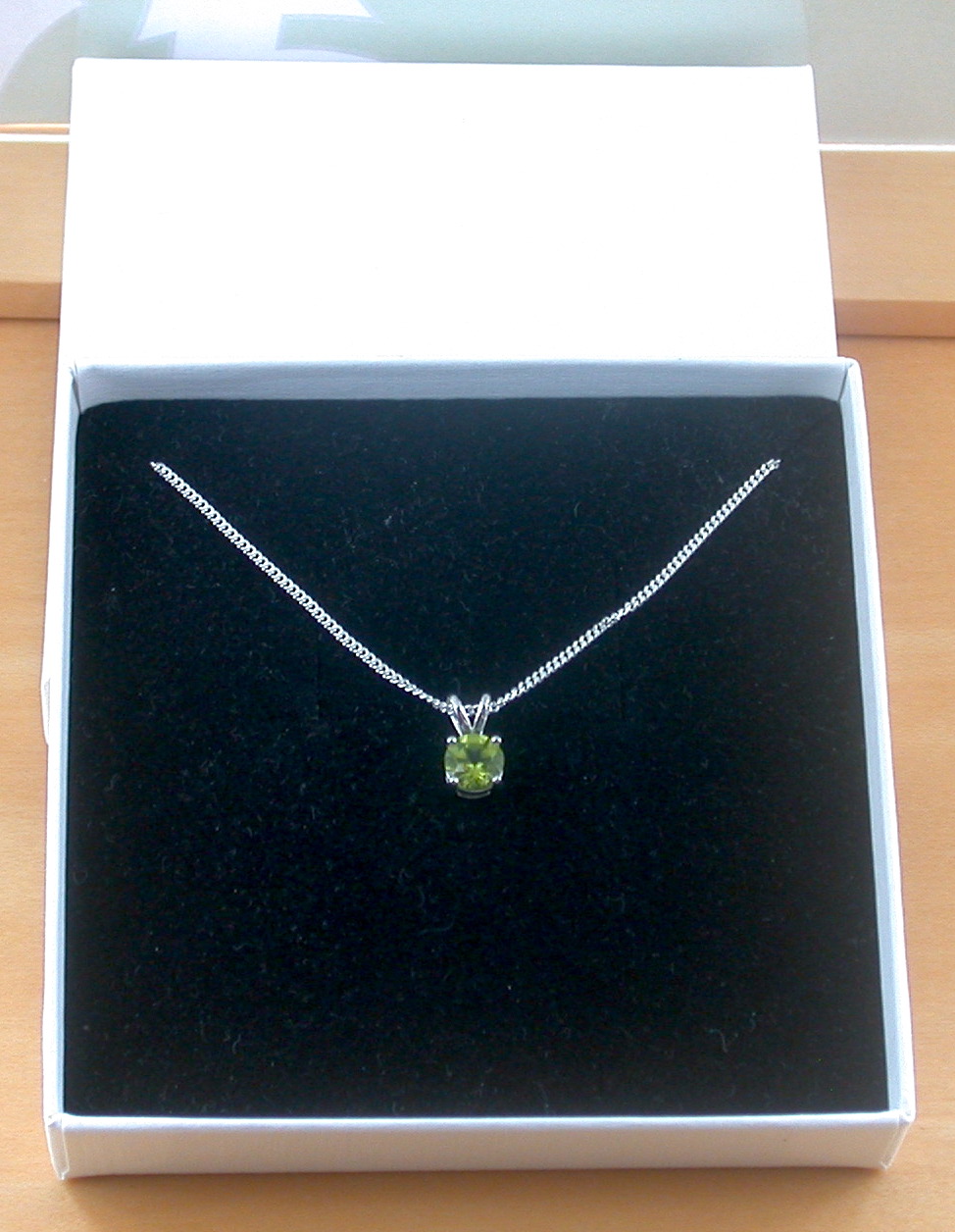 This pendant and chain will come complete with presentation gift box and a pretty organza gift bag. Includes peridot gemstone description gift card below.