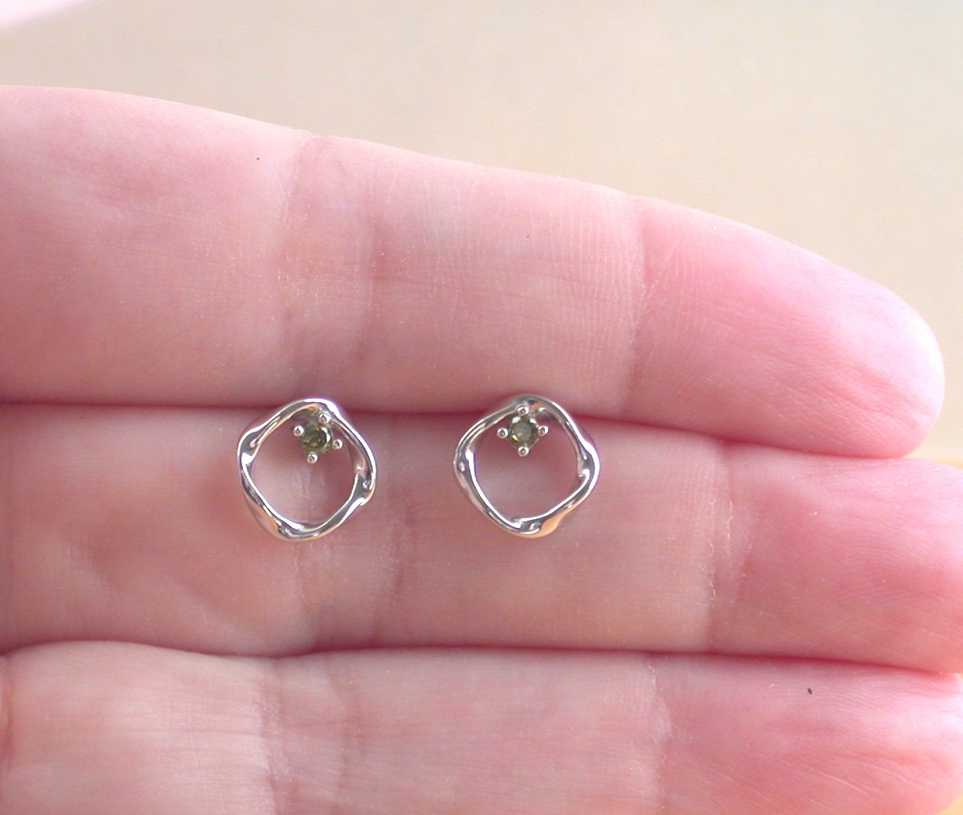 Sterling silver, circle stud earrings set with peridot gemstones. These earring measures 10mm height x 10mm width. Stamped 925. Peridot is the birthstone for August.