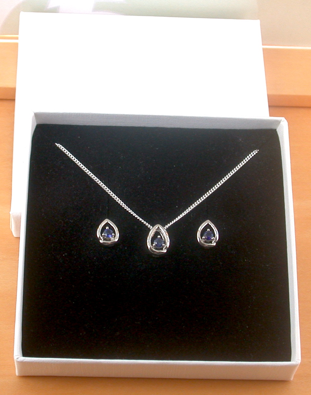 This pendant, chain and earrings will come complete with white presentation gift box. This will also include sapphire gemstone description gift card below: