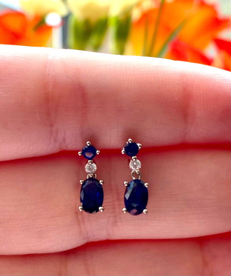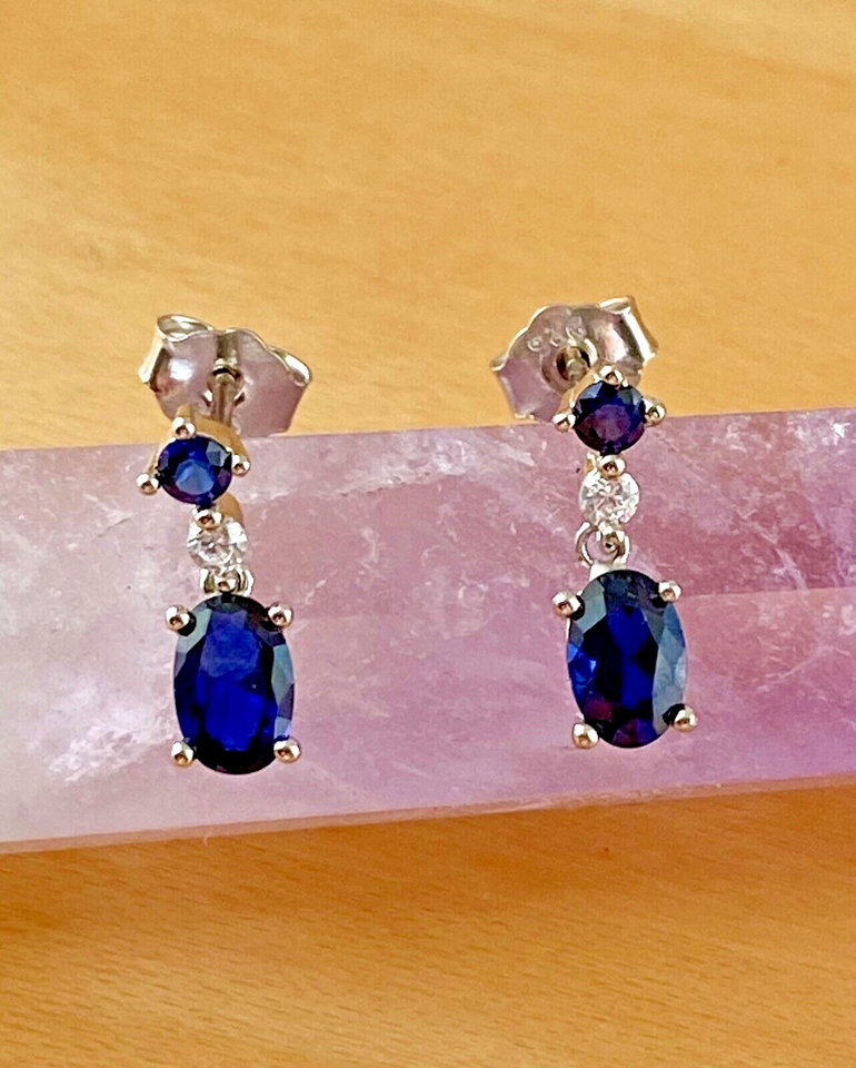 Sterling silver sapphire (lab created) gemstone stud earrings with Cz gemstone. These earrings measure 13mm height x 6mm width. Stamped 925. Sapphire is the birthstone for September.