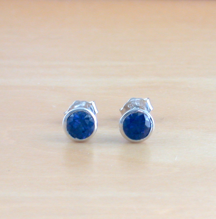 Sterling silver, round stud earrings set with lab created sapphire gemstone. The gemstones measure 5mm height x 5mm width. Stamped 925. Sapphire is the birthstone for September.