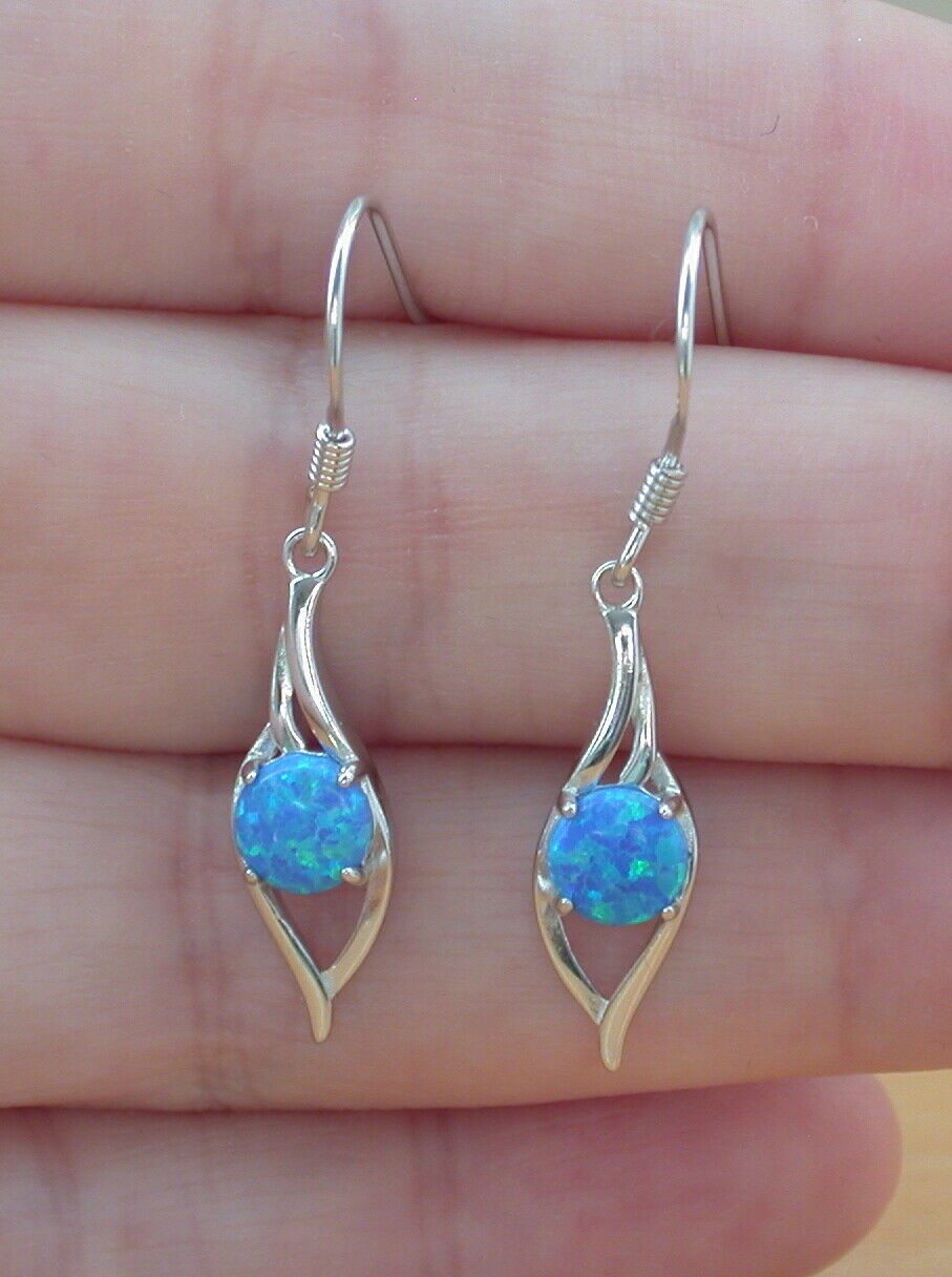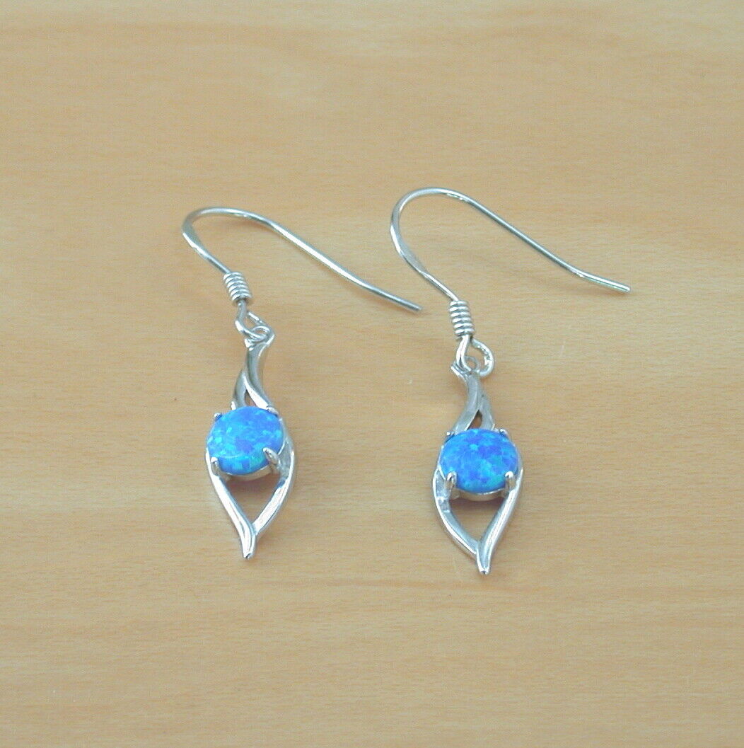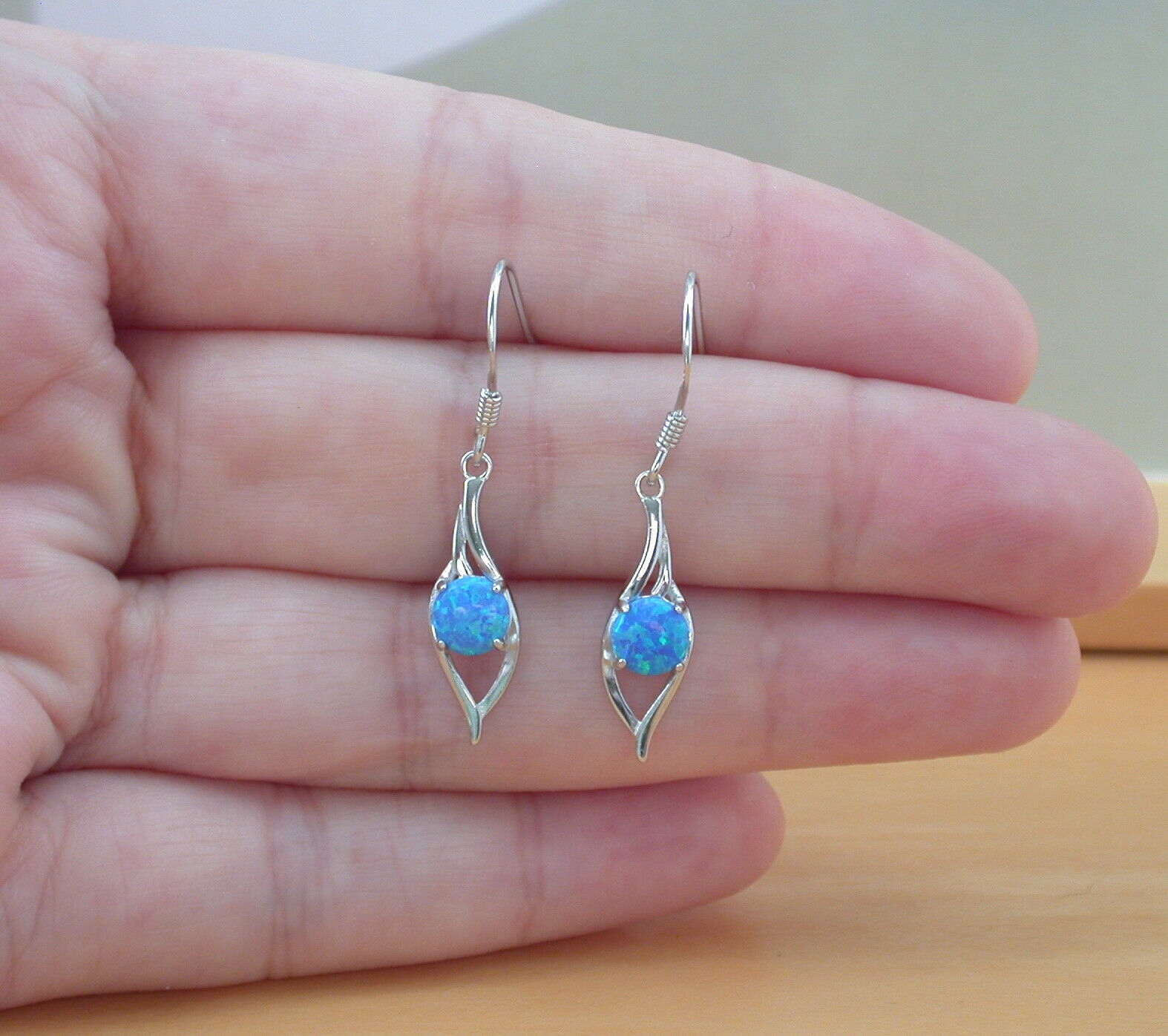 Sterling silver, blue opal (lab created) gemstone drop necklace and earrings. This pendant measures 22mm height x 8mm width. The opal gemstone measures 5mm. This pendant will come complete with an 18 inch sterling silver curb chain. These earrings measure 20mm height x 7mm width. The gemstone measures 5mm. Opal is the birthstone for October.